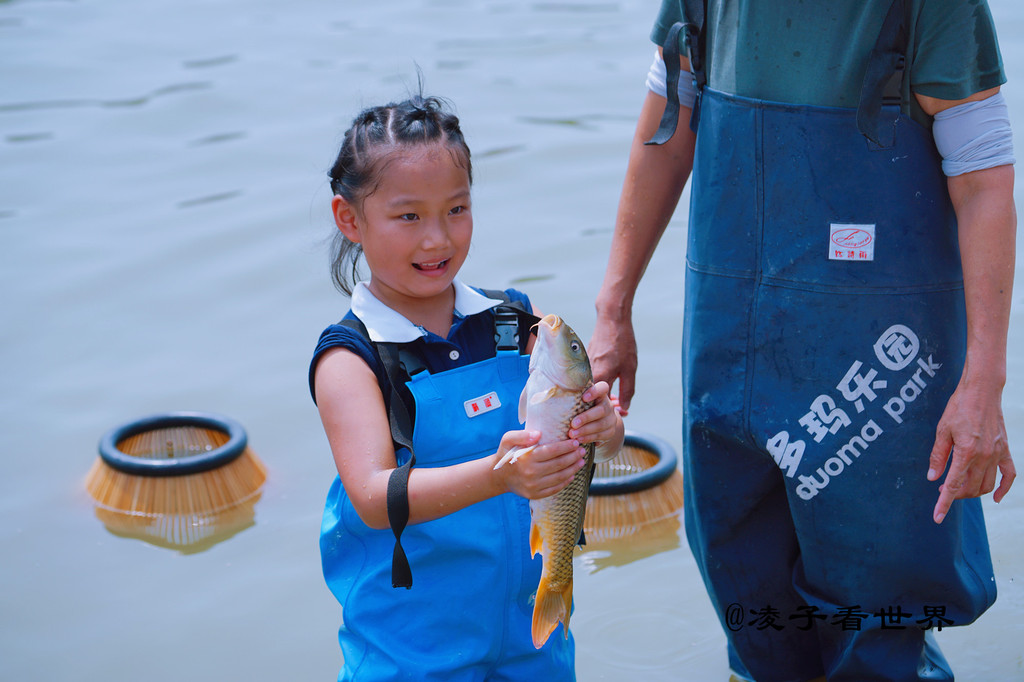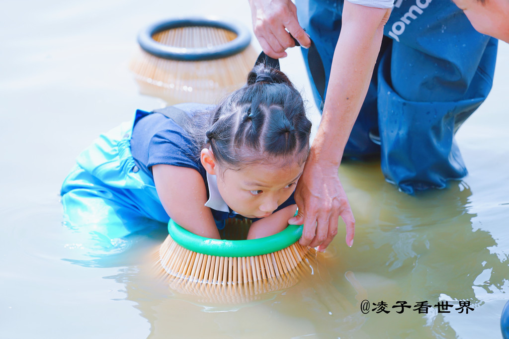 瓮中捉鱼是一个特别有意思的捞鱼方式,在稻田中用一个竹篓去扣鱼,这完全是凭经验和运气,这个小女孩和奶奶一起努力,竟然捞到一条很大的鲤鱼。孩子特别高兴,劳动有成果就开心。