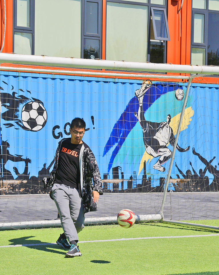 酒店外有一个绿草茵茵的足球场,小伙伴是个足球爱好者,禁不住奔跑着踢起球来,看他的矫健的奔跑、守门,真是个不错的球员呢。