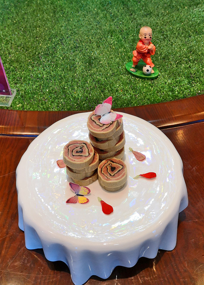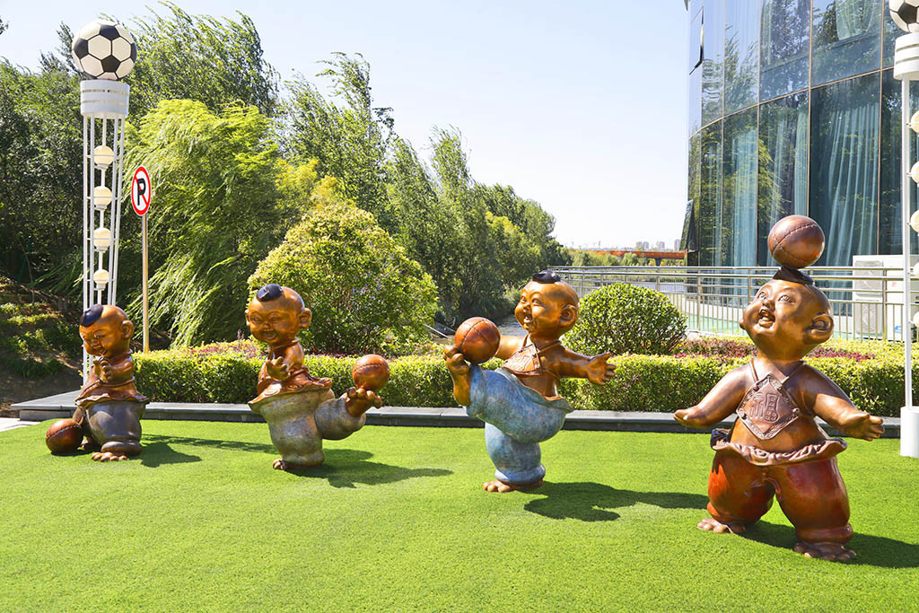 这座足球公园,有足球场,能住宿,有餐饮。午餐美食不仅味道好,而且菜品的摆盘也很好看。餐台中心放着少林小子诙谐的足球雕塑,时刻让你看到足球的元素。