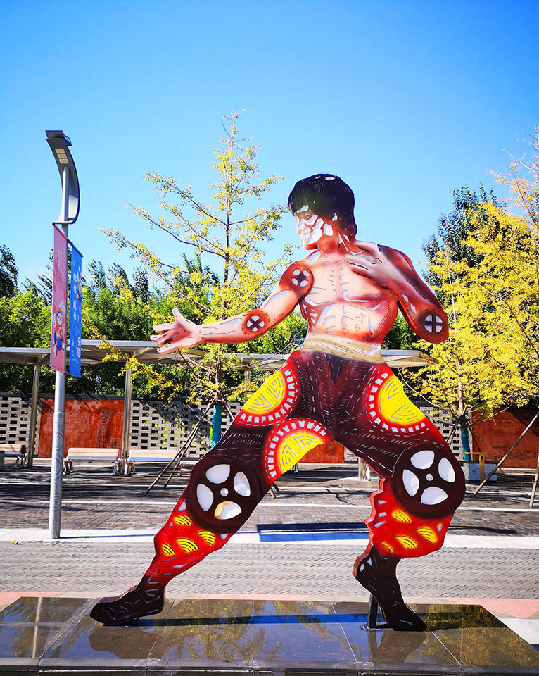 唐山皮影风格独特,源同于冀东滦州的乐亭影调,唐滦地区的掐嗓唱法十分独特。皮影园两侧树立着逼真的古代与现代的皮影人物。