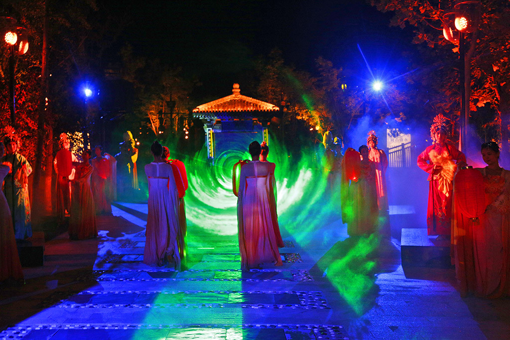 每晚8点,南湖上演着一部实景体验剧那年芳华,讲述着唐山的故事。美轮美奂的演出场景不断变换,观众融入其中,身临其境跟随着剧情不断的走动着不同的场景地观看,实景剧还可以这样看,我可是第一次看呢,好新鲜的演出。