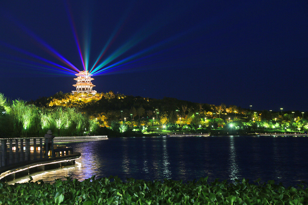 夜幕降临时刻南湖上演着一场炫酷的水舞光影秀,一幕幕展示着唐山的建设路程与成果,让人赞叹。