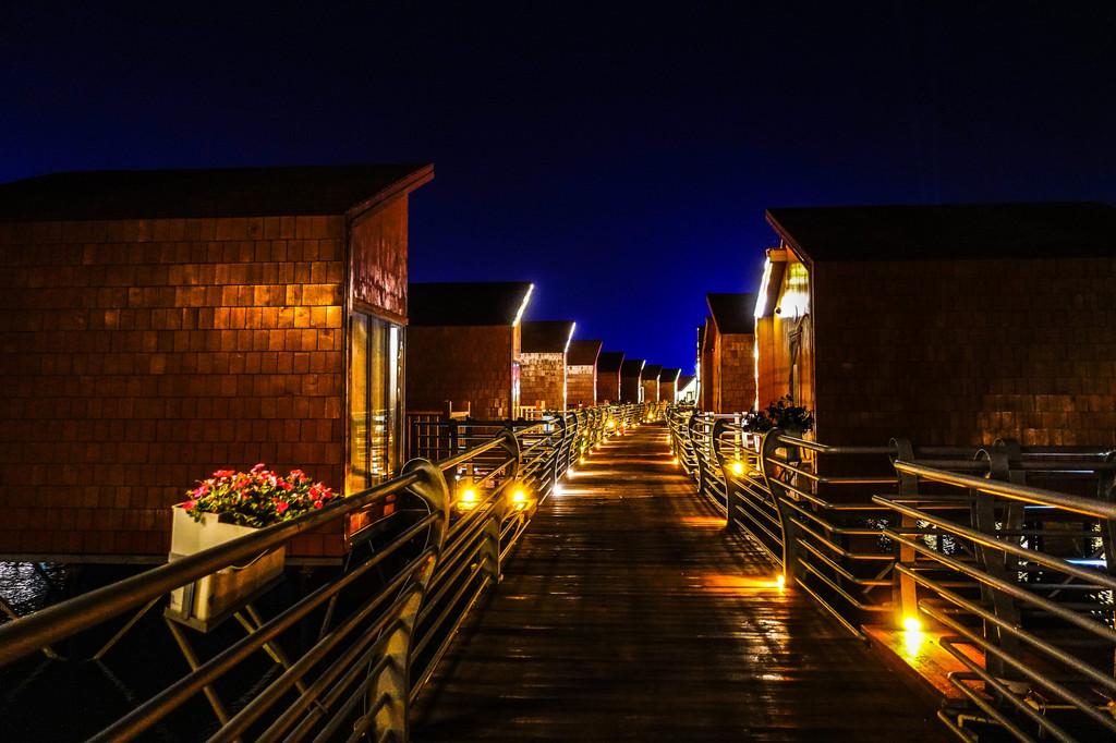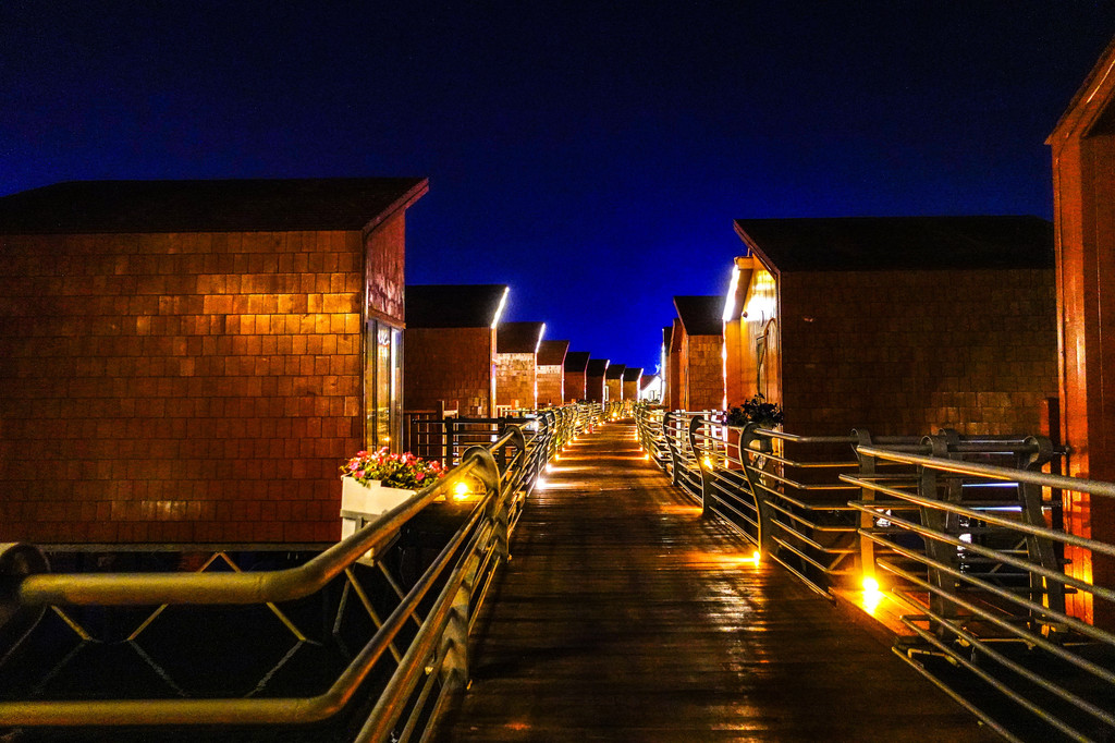 海上生明月,天涯共此时,万盏灯火点亮了渤海湾上的那颗明珠,抬头仰望,仿佛那天上的明月也感应到了人间的那湾“晓月”,露出月牙般的笑脸,俯瞰华灯初上的月坨岛。这里小木屋、别墅成群,设计者还为他们起了如诗的美名,"月乡水榭"沿着木栈道,从高处俯瞰,犹如一张编织的巨大渔网洒落在月岛之上。
