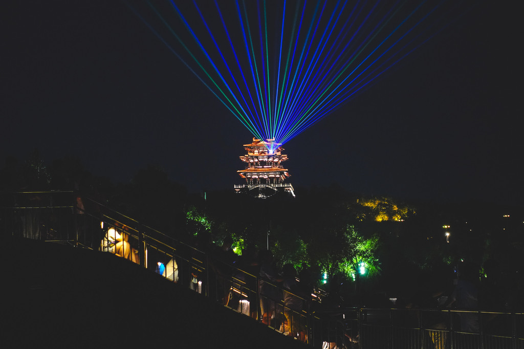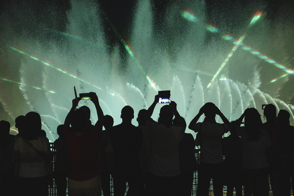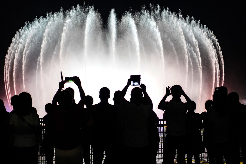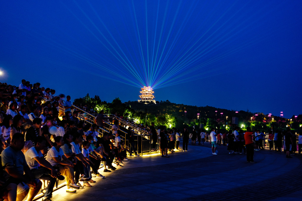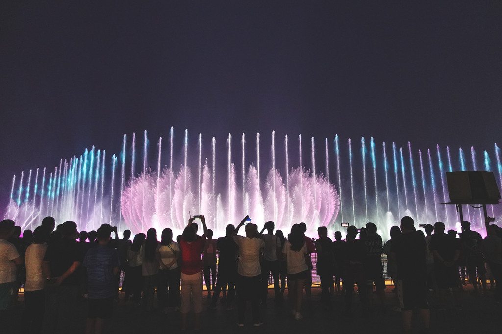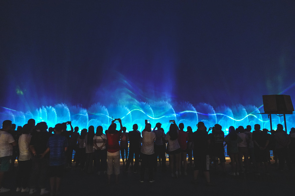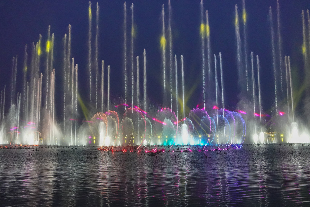 跳动的音律,此起披伏的音乐喷泉,在一首一首歌曲中变幻不同的造型,高达200余米的水柱仿佛直冲云霄,在夜空中幻化千姿百态,通过高科技打造的灯光+音乐秀,成为了南湖上又一道靓丽的风景线。