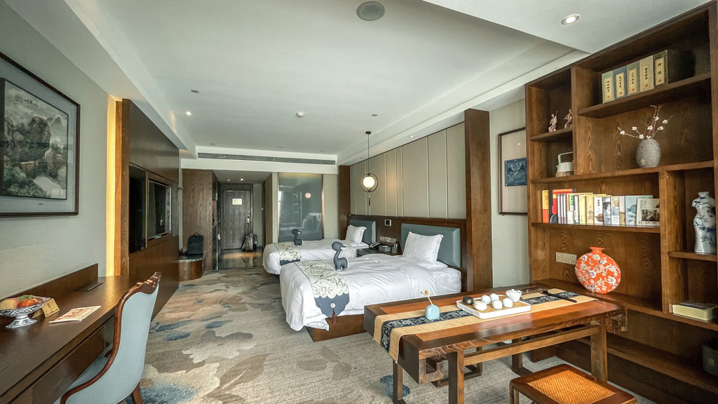 将唐代古典建筑与唐山老手工艺术品完美结合,贴心和舒适是这座酒店给我最大的感触,宽敞舒适的房间,还有长长的茶几,准备了茶道用品、古典文化书籍以及现代化的空气净化器,可视门禁、咖啡壶、熏香等等硬件配备,让人感觉既放心又舒适!