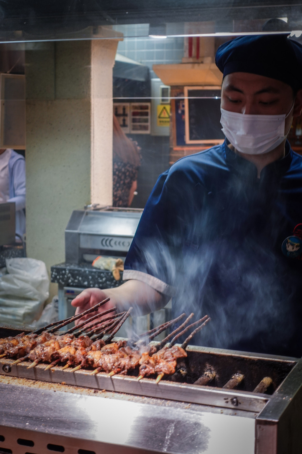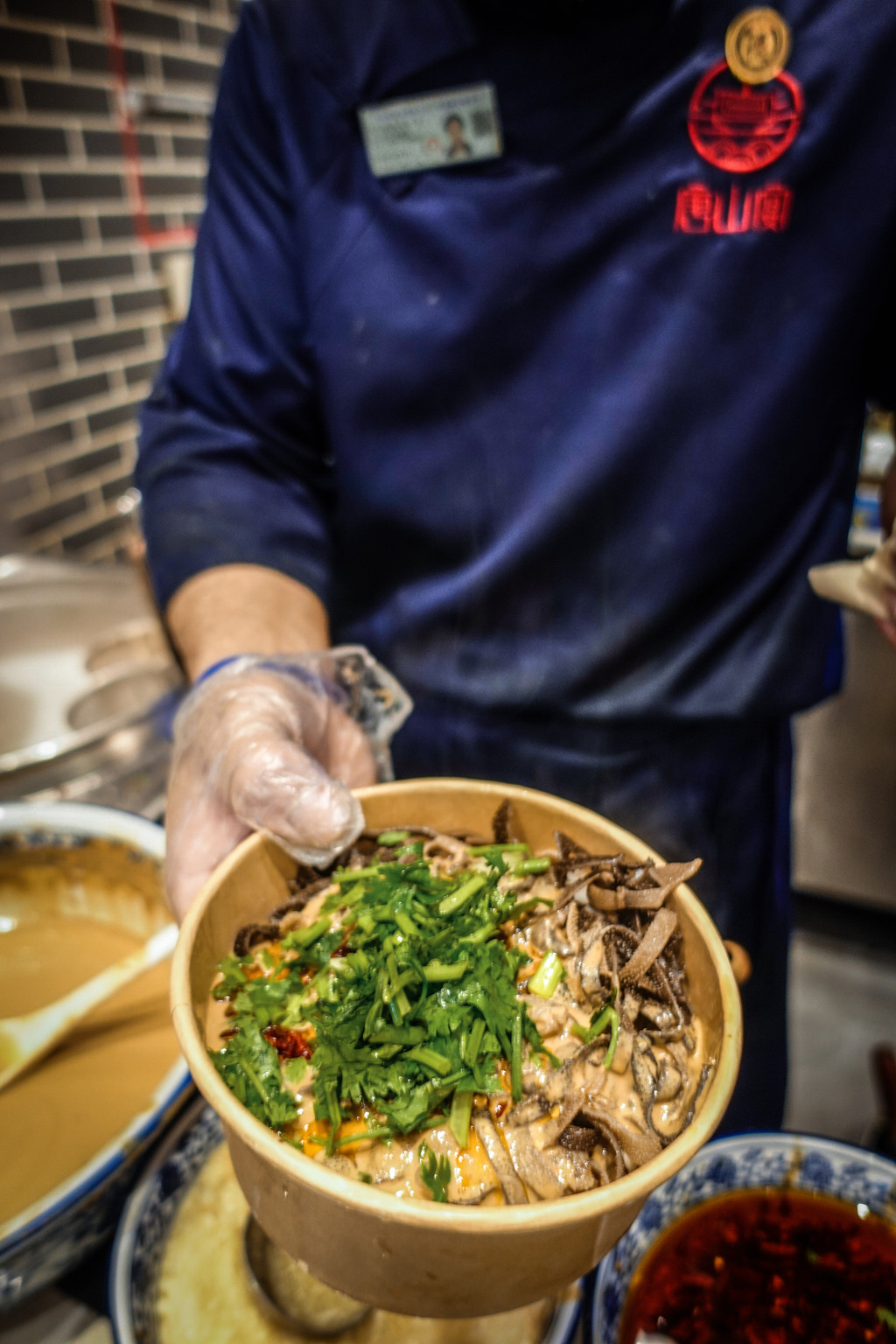 我们点了满满一大桌子小吃,羊汤泡饼、凉粉、红柳羊肉串、棋子烧饼、迁西板栗、水爆肚、烧麦……