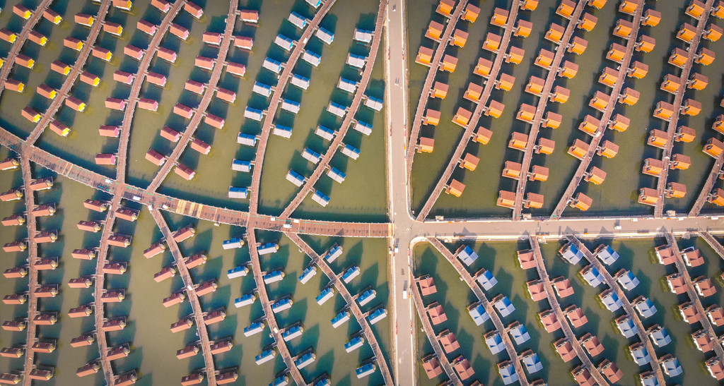 唐山湾三岛中月坨岛,被称作是“北方马尔代夫”,一座座颜色各异的小木屋,整齐划一地矗立在海平面,粉色、黄色、蓝色、绿色…不同的颜色交织在一起,从高空俯瞰,这些小木屋在海面上形成优美的弧线,夜晚灯光亮起下,像是一颗颗璀璨的明珠,照亮了月坨岛的上空。