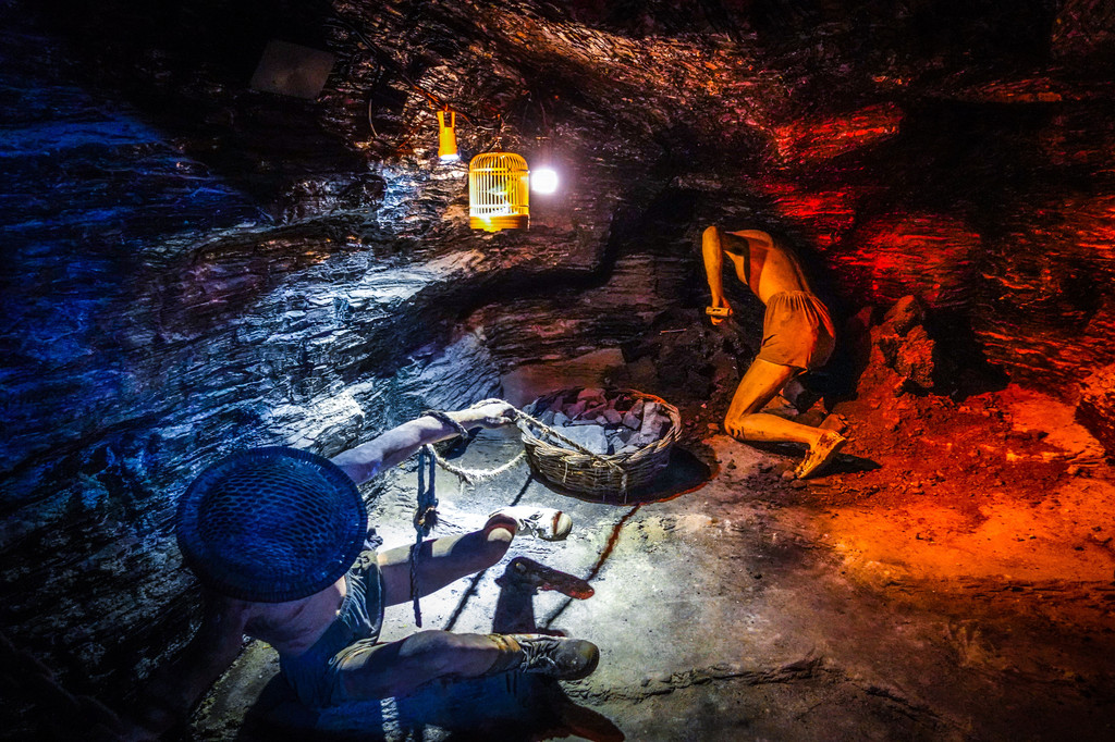 从四层乘坐模拟“罐笼”直达地下,带上安全帽,在讲解员的带领下,犹如进入一个时空的隧道,此刻化身矿工来探秘百年开滦的“井下”工作和生活。