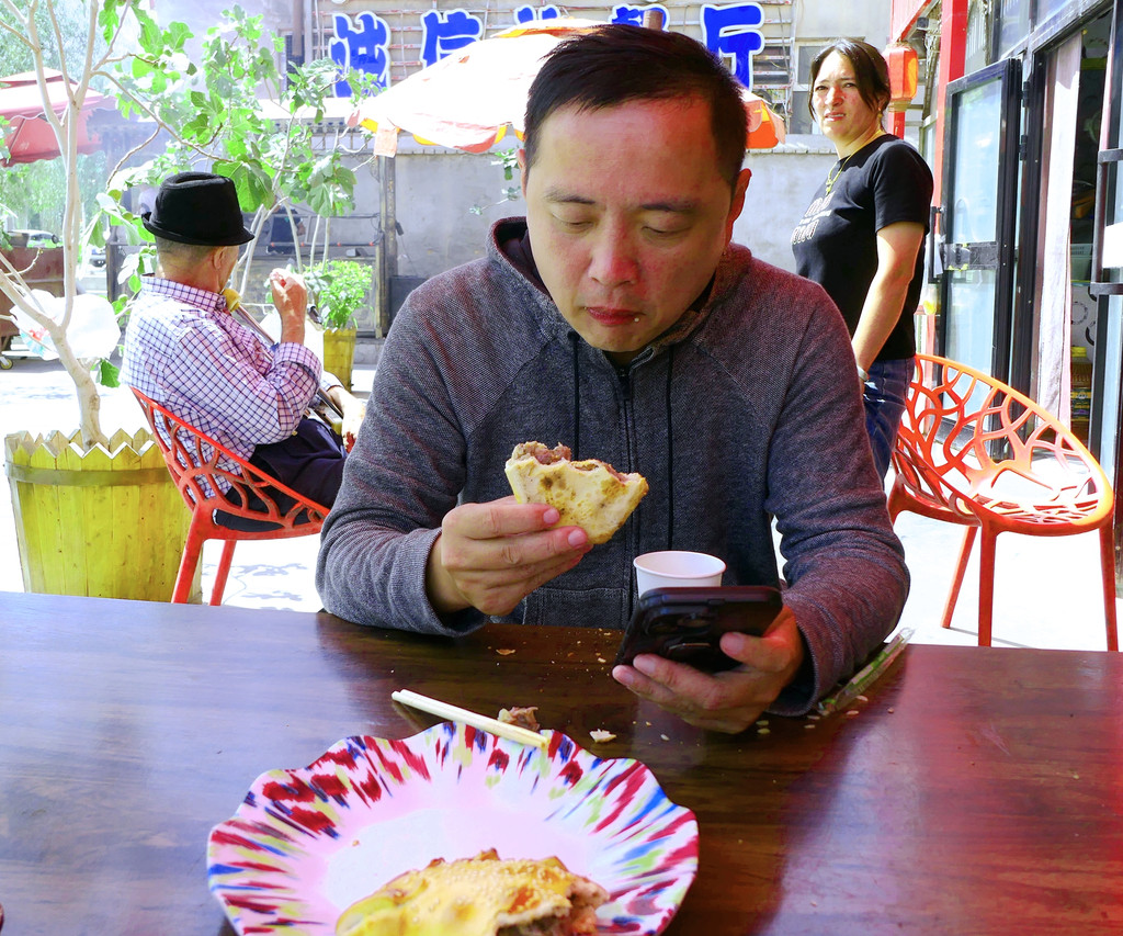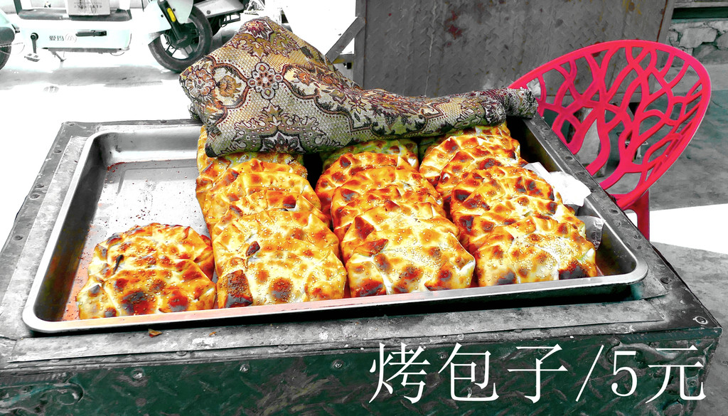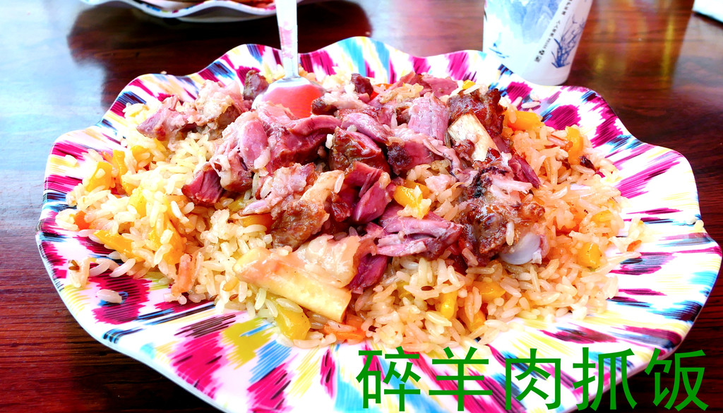 午餐要了烤羊肉串、烤包子、抓饭和西红柿鸡蛋拌面,其中,前三样都是我们此番来新疆所吃过最满意的。羊肉串5元/串,蛮大的烤包子也是5元一个。碎羊肉抓饭22元,感觉要比喀什古30元一份的羊腿抓饭还要好吃,西红柿鸡蛋拌面15元。在新疆吃抓饭都可以“加米”,也就是羊肉限量,米饭管饱。餐厅服务员一直要为我“加米”,但只可惜我胃口有限,在免费加米与付费烤串之间,我还是宁愿再多吃一份烤羊肉串。
