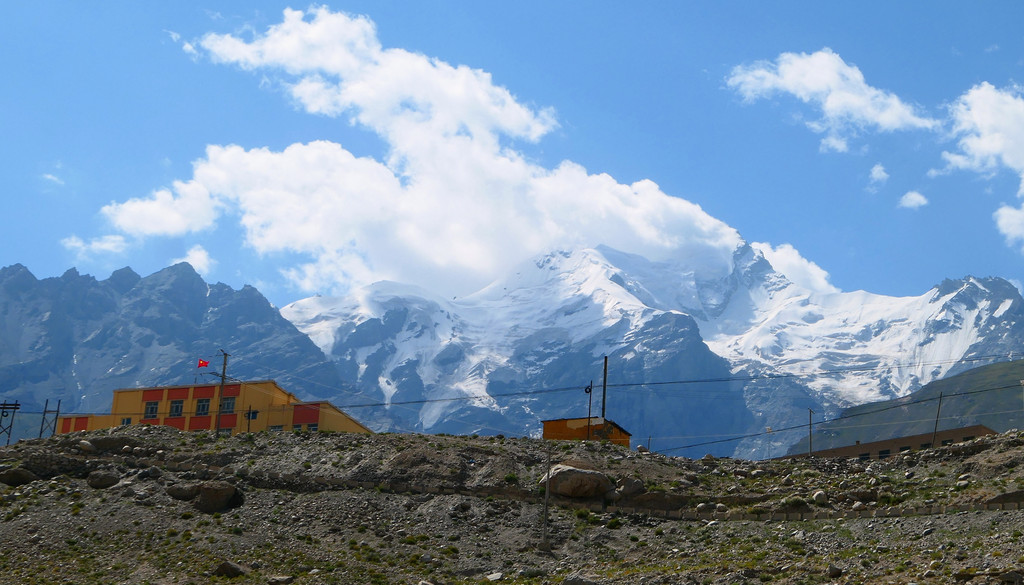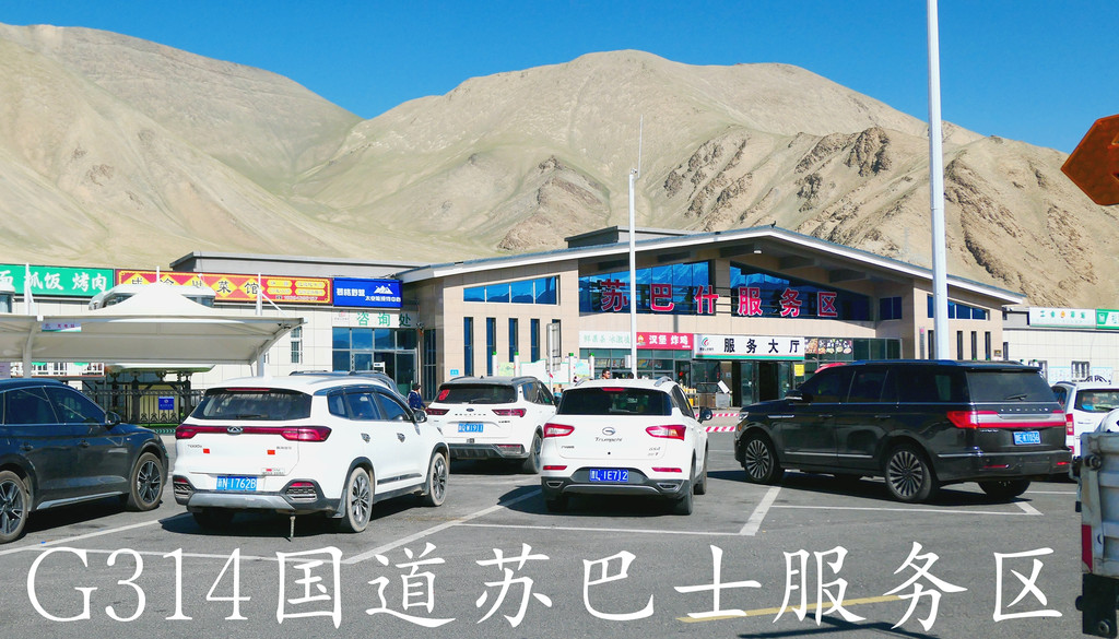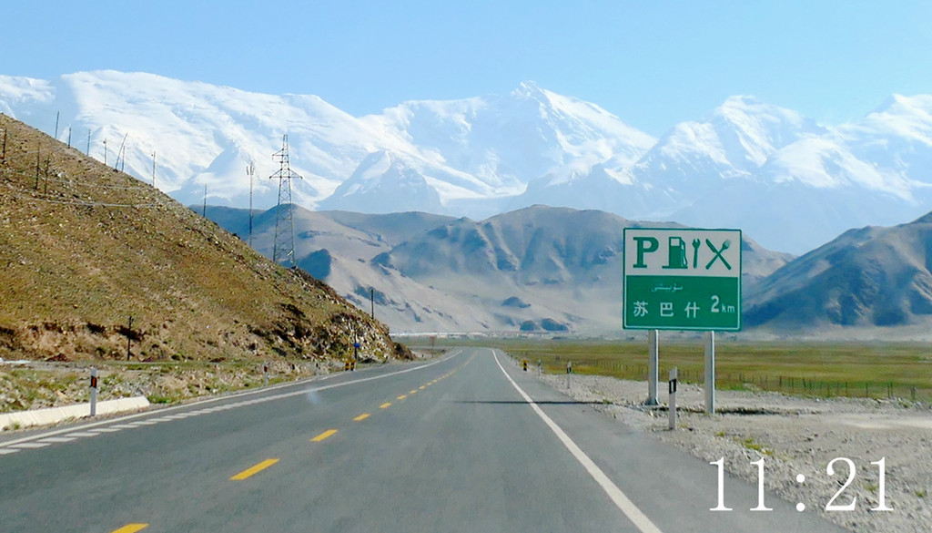 11:22在苏巴什服务区稍停,此地已属克州(克孜勒苏柯尔克孜自治州)阿克陶县境内。这是一座颇具规模的服务区,附设宽阔停车场。公格尔雪山在服务区的北侧绵延,南侧则是卡瓦博格雪山巍峨矗立。