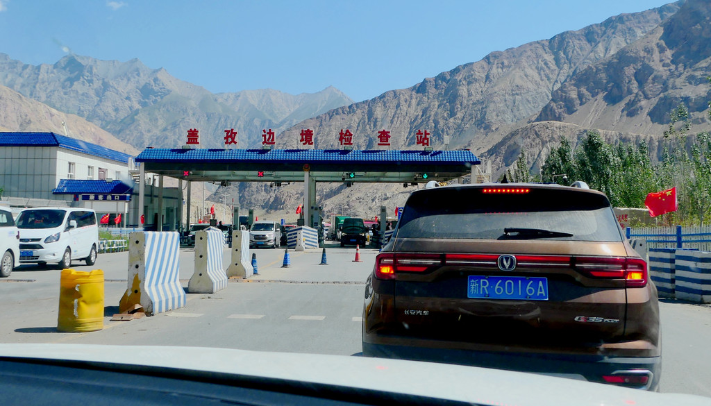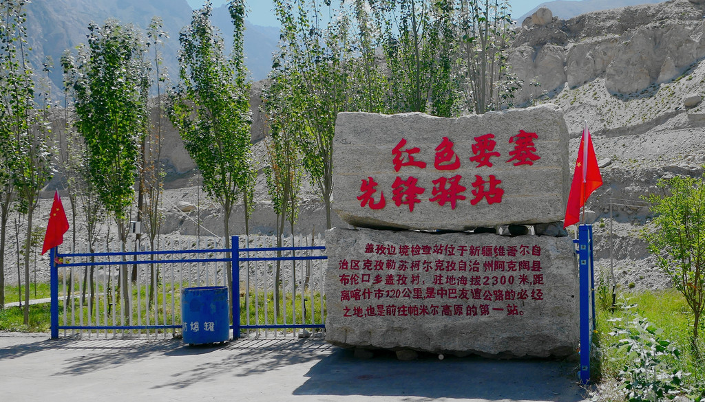 12:44穿越海拔约2500米的公格尔隧道,驶出隧道再前行不远就是“盖孜边境检查站”。我们两日前从喀什前往塔县须在此处查验边防通行证,但此刻却是无障碍通过。边检站位于克州阿克陶县布伦口乡的盖孜村,海拔2300米,距离喀什120公里,它是国道G314通往帕米尔高原的门户。