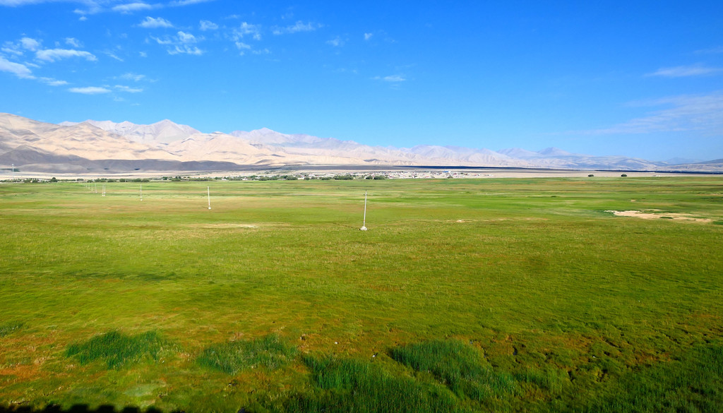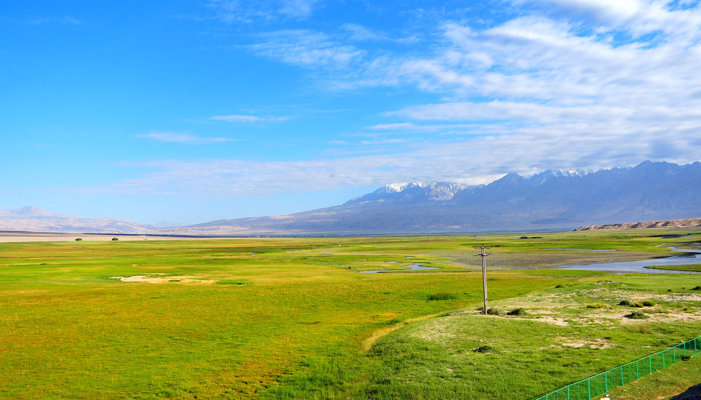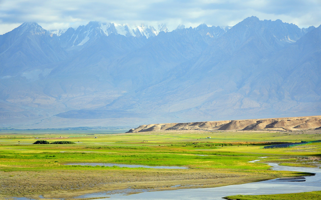 随后是沿着一条小河穿越峡谷,约7分钟后驶出。再向前行不远便是塔合曼湿地南观景台,两天前从喀什到塔县,我们也曾路经此地、稍事逗留。不过,那天为傍晚、逆光,拍照效果不好,今天则是清晨顺光,拍照效果甚佳。塔合曼湿地距离县城32公里,慕士塔格雪峰的冰川融水造就了这一大片水草丰美的牧场,站在观景台上,眼前所见之皑皑冰峰就是慕士塔格雪山。