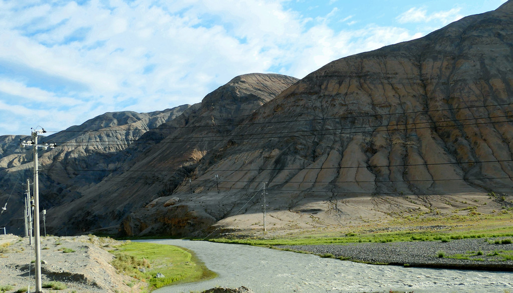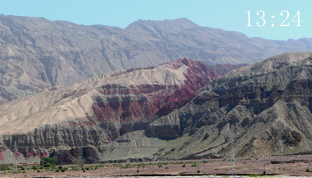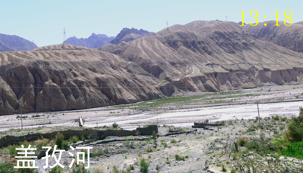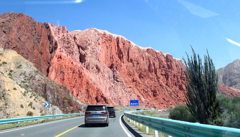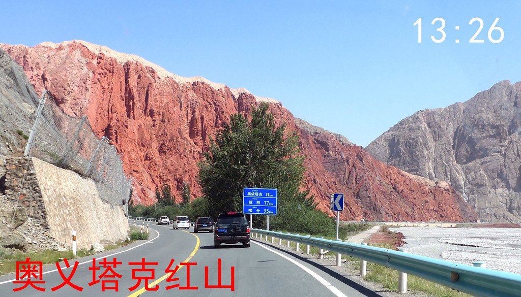 继续前行,盖孜河峡谷逐渐变宽,河水缓缓地流淌,河床上随处可见大片裸露的鹅卵石滩,视野中也出现了较多的绿色。峡谷两侧的山峦变得较为平缓,山体表面也出现了层次分明的不同色调。13:26驶出峡谷,重返奥伊塔克红山地域,放眼所及,周边山峦全都是单一的红色,两日前我们曾在此处逗留,今日驱车直驶而过。