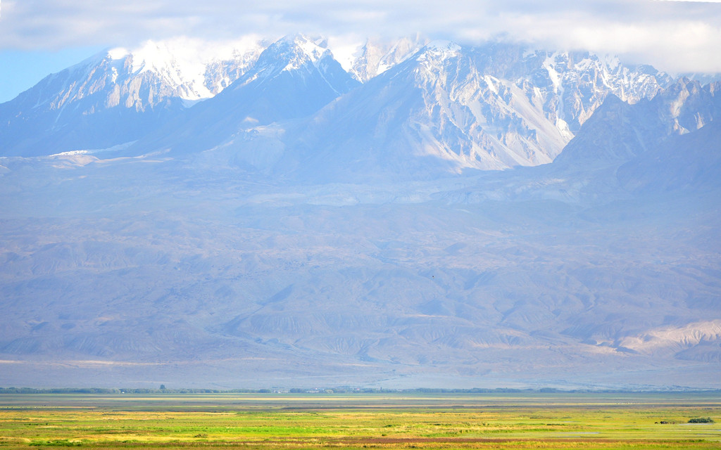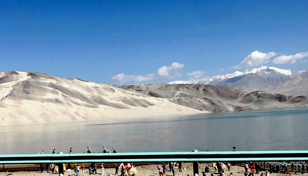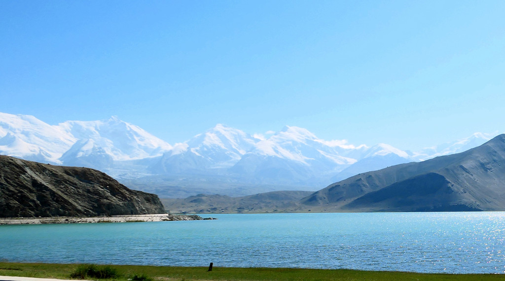 白沙湖的景色也是随观看角度的不同而变,我们前日自北向南从喀什过来,感觉白沙山并不白,沿着湖岸行驶也没看到雪山。今天是由南向北从塔县驶往喀什,刚一进入湖区就看到连绵的雪峰扑面而来,冰清玉洁,非常漂亮,它们都是昆仑山脉西端公格尔山系的冰峰。