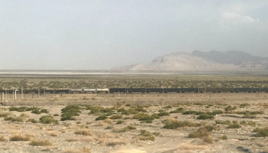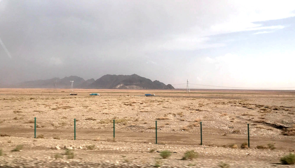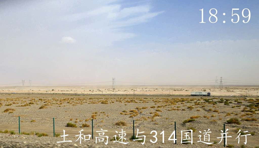 18:59在戈壁滩上遇到了沙尘,汽车钻入漫天黄沙,但是只隔没多久又下起了小雨,沙尘立马消失,估计沙尘是因雨前刮风所致。国道G314在土和高速的右侧与我们并行,主要都是一些重型卡车在国道上奔跑。右侧还有一条平行的铁路,有一长列货运列车在行驶。