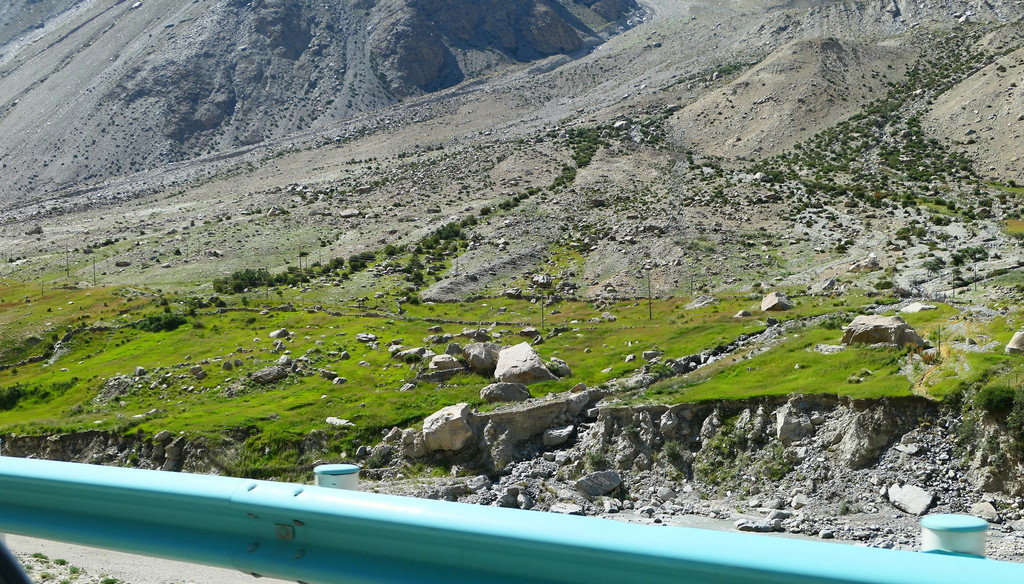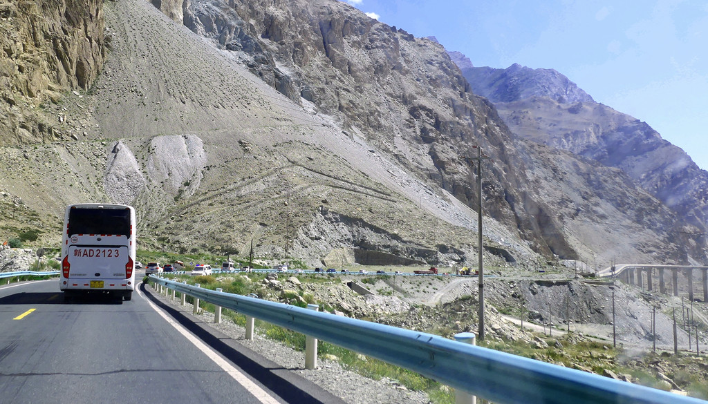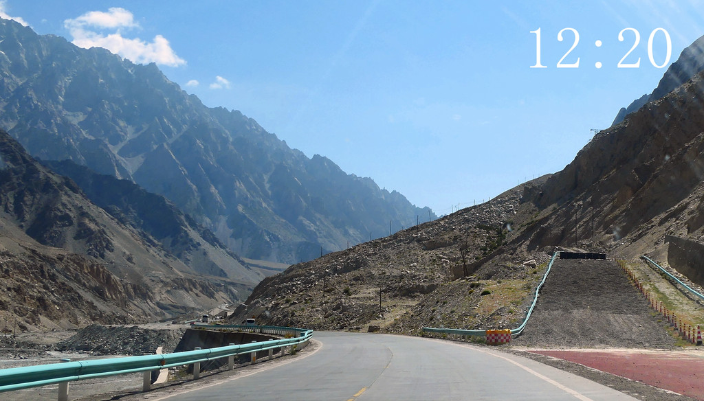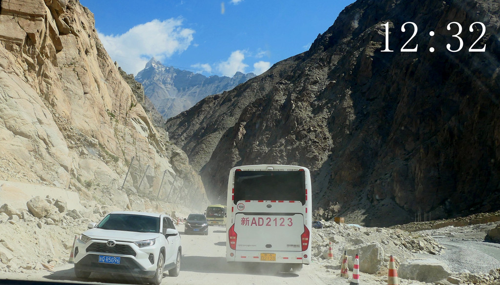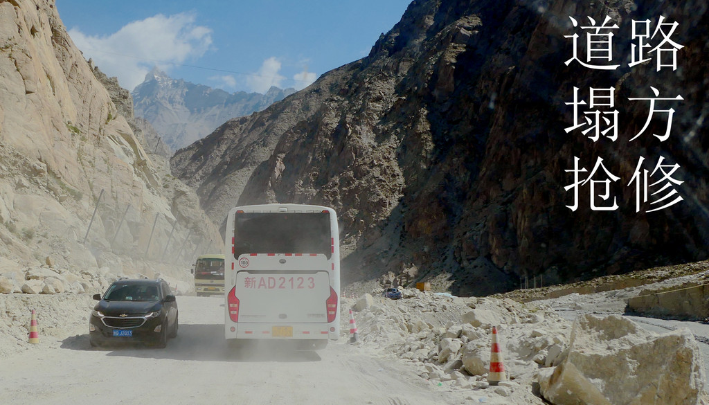 12:32驶经我们8月6日从喀什过来曾遇塌方堵车之处,经过两日抢修,现时已无交通管制,双向车辆都可缓慢通过。然而,路边仍然堆放着巨大的落石,抢修现场尘土飞扬。