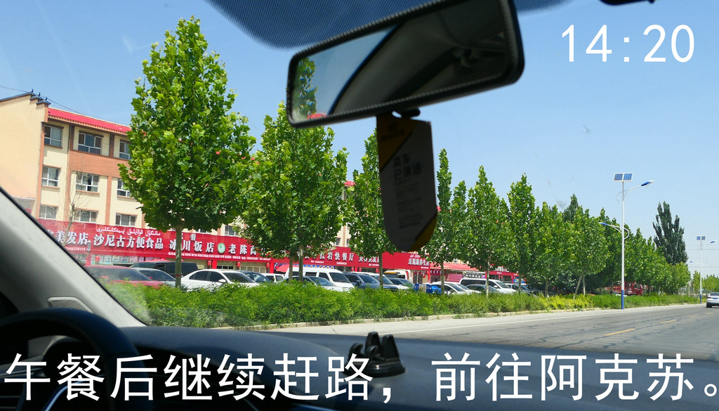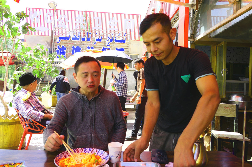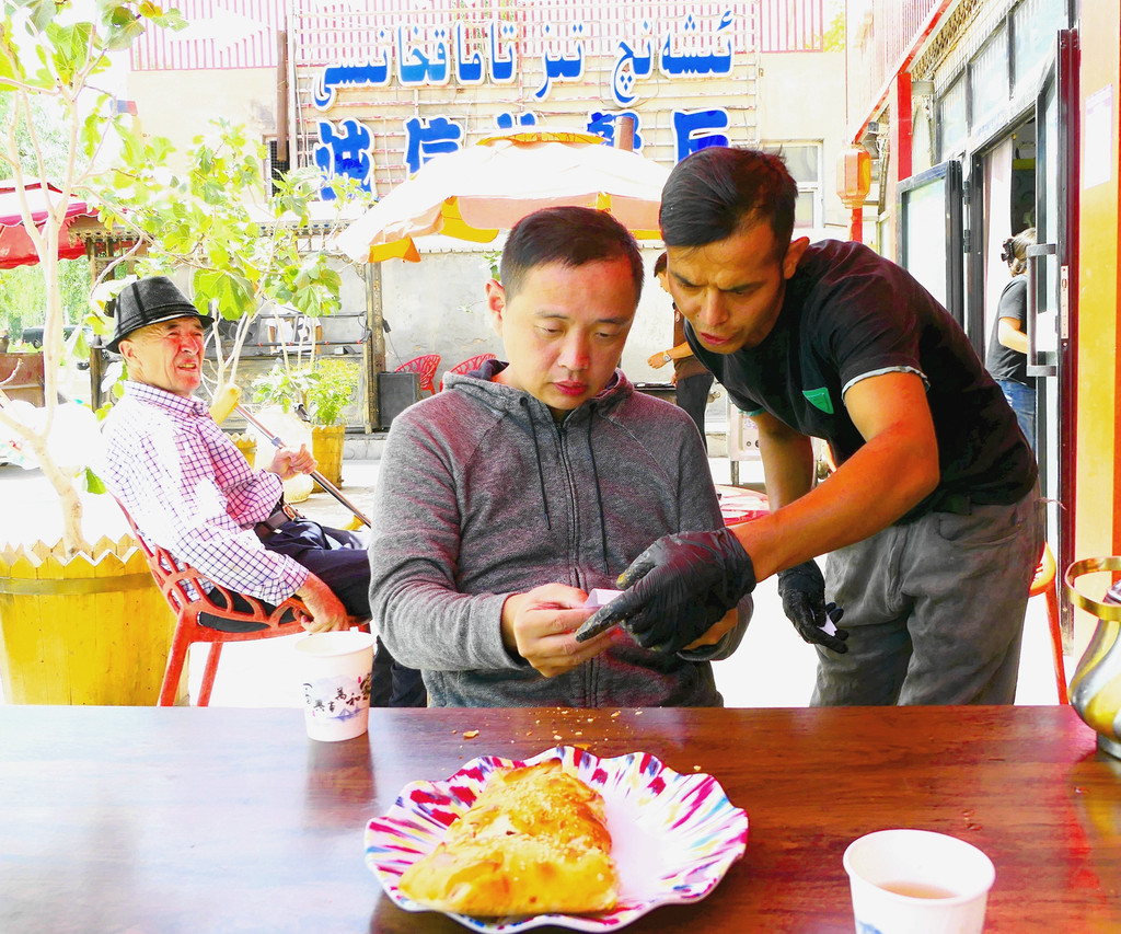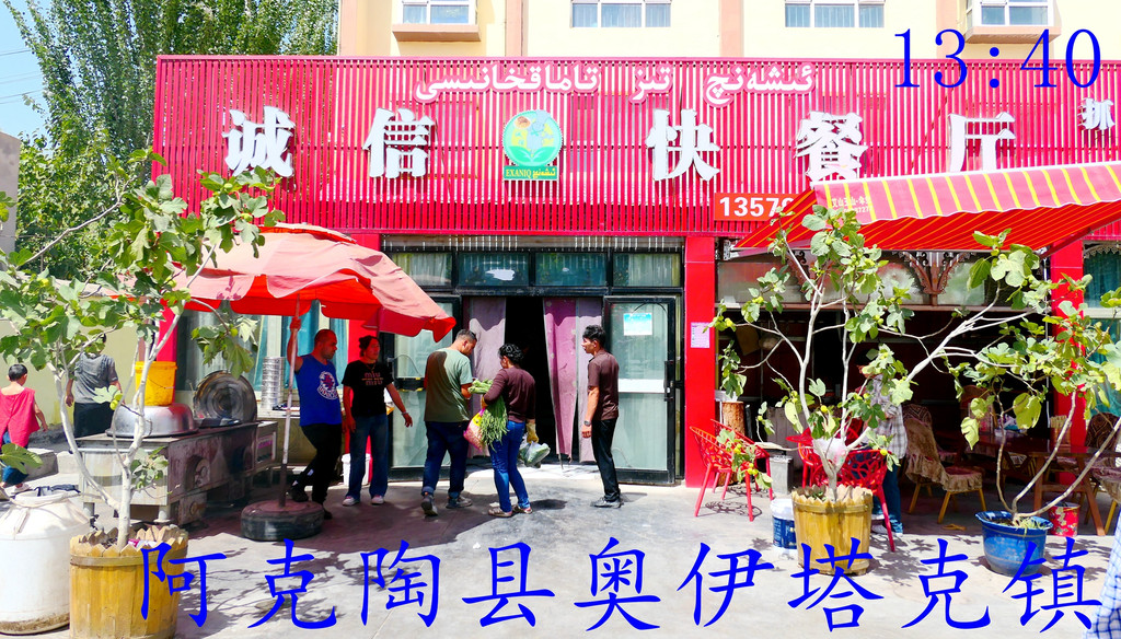 13:40,我们在阿克陶县奥伊塔克镇停车用午餐。作为国道G314沿线的重要 驿站,小镇餐馆、商铺林立。我们走进一家名为“诚信快餐厅”的餐馆,老板和员工都是当地维吾尔族,待客热情,价格也很合理,不愧“诚信”二字。