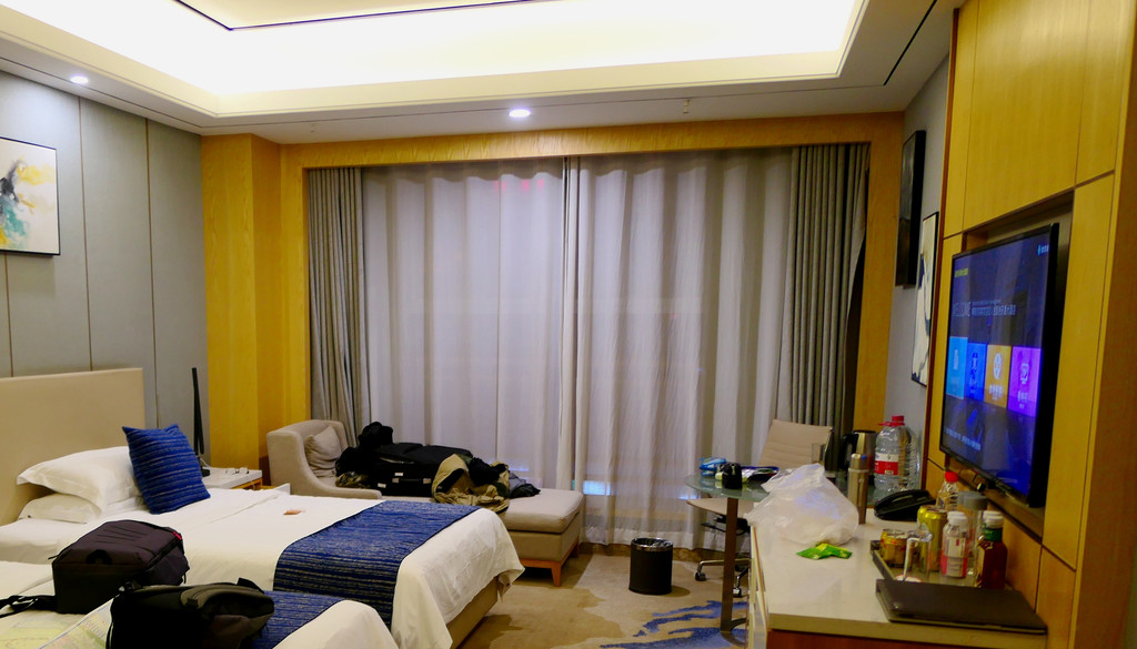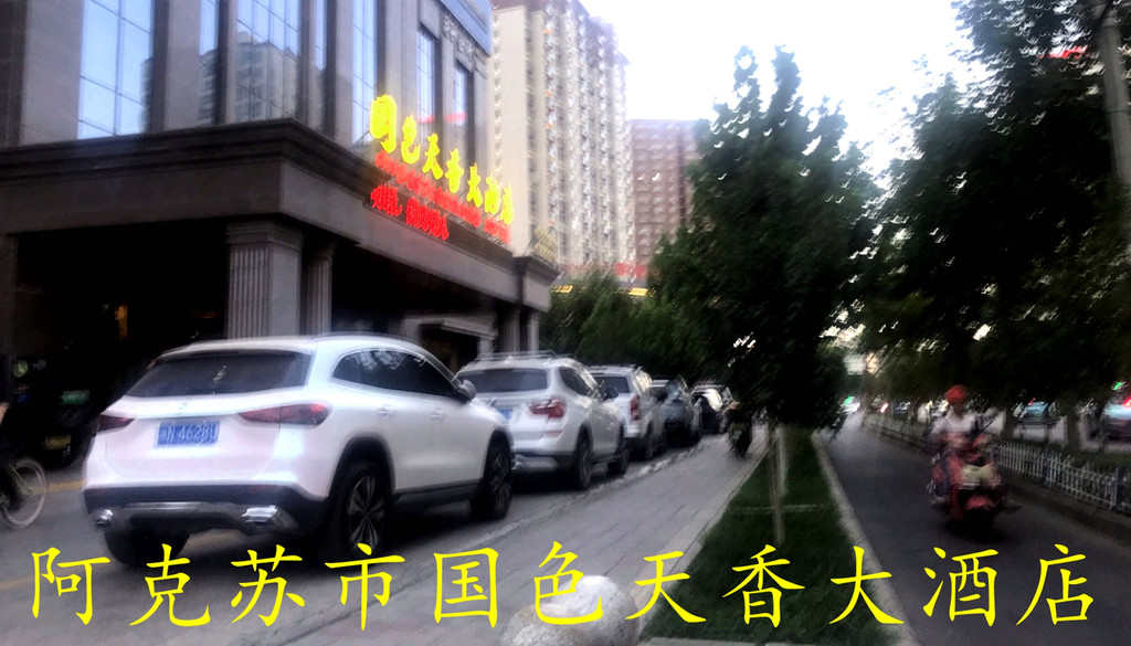21:11驶经“库勒服务区”,没有进入。21:20在土和高速的“阿克苏出口”下高速。21:28在中石油“阿克苏阿温公路加油站”加油329元。21:39入住位于幸福北/新华路口的国色天香大酒店。酒店属豪华型,附设地下停车场。此刻天空依旧明亮,我们终于是按照预定计划,在天黑以前赶到了阿克苏。