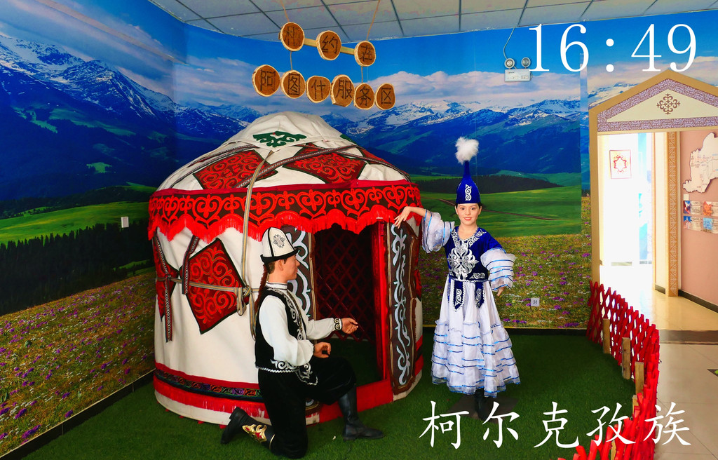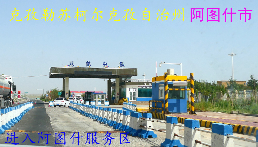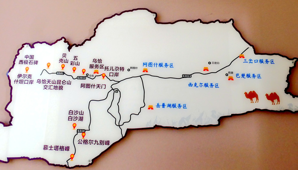16:43经停土和高速阿图什服务区,地属克州阿图什市。克州是柯尔克孜族聚居区,服务区内有一处描述柯尔克孜族牧民生活场景的模型,可供游人打卡,还有一幅阿图什市周边旅游景点分布的示意图。