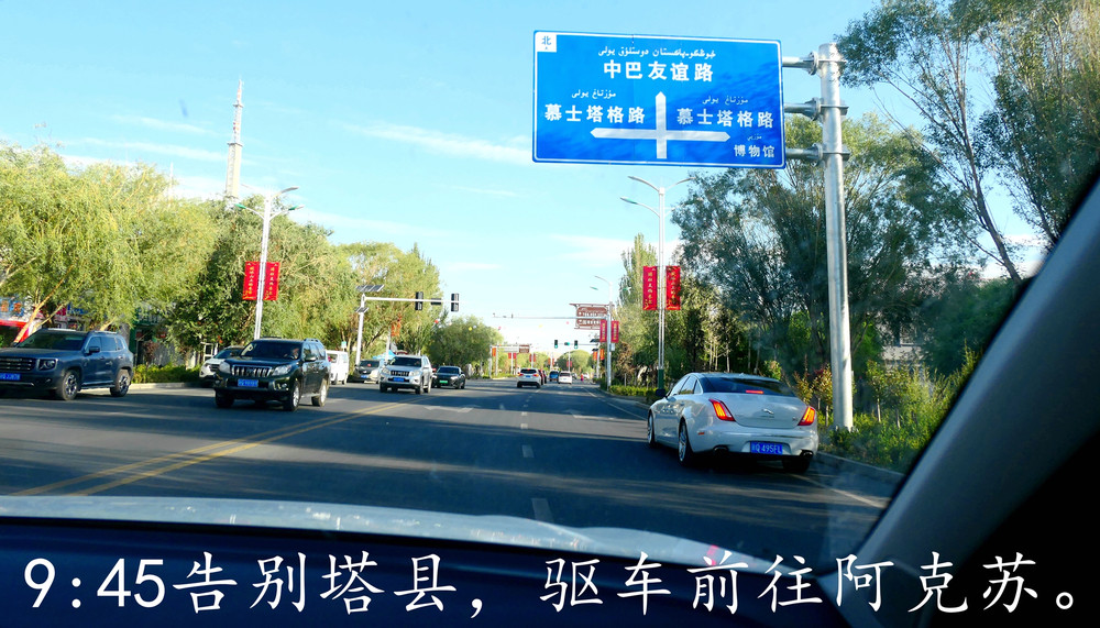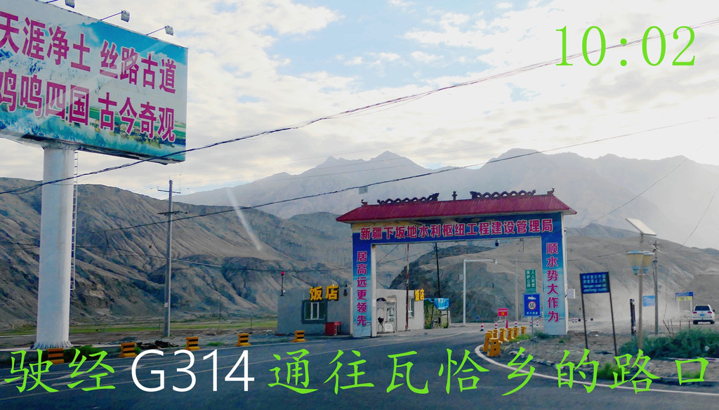 9:45告别塔县,沿国道G314(中巴友谊公路)北行,奔赴阿克苏。10:02途经国道G314通往瓦恰乡的岔道入口,岔道口耸立一座牌楼。昨日,我们从瓦恰乡出发,驶经班迪尔蓝湖、帕米尔之眼,正是经由此处路口返回县城。