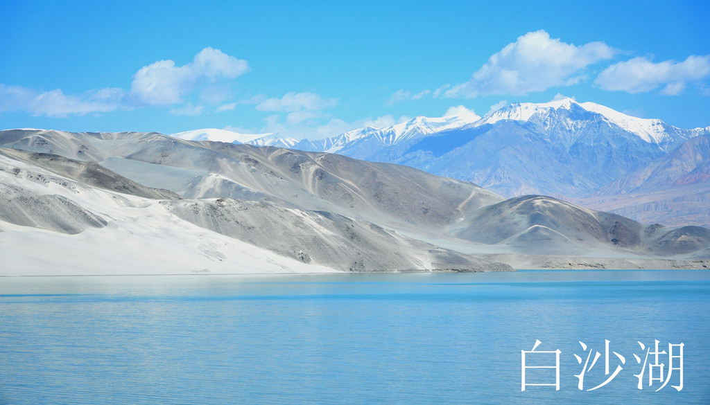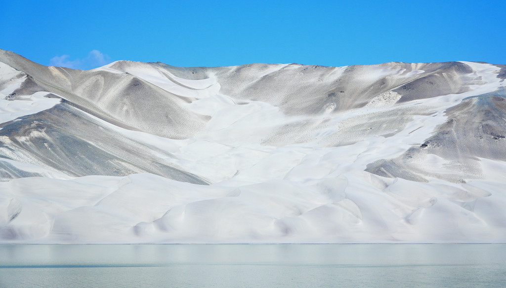 许是光线角度不同,今日所见的白沙山与白沙湖,比前日在北观景台时之所见,更显风光秀美。蔚蓝色的湖水映衬沙山、雪山、蓝天、白云,构成一幅绝美山水画卷。尤为幸运的是,我们今日还有幸一睹真正的“白”沙山风貌。