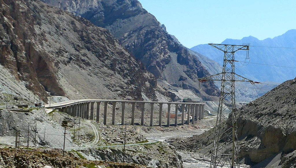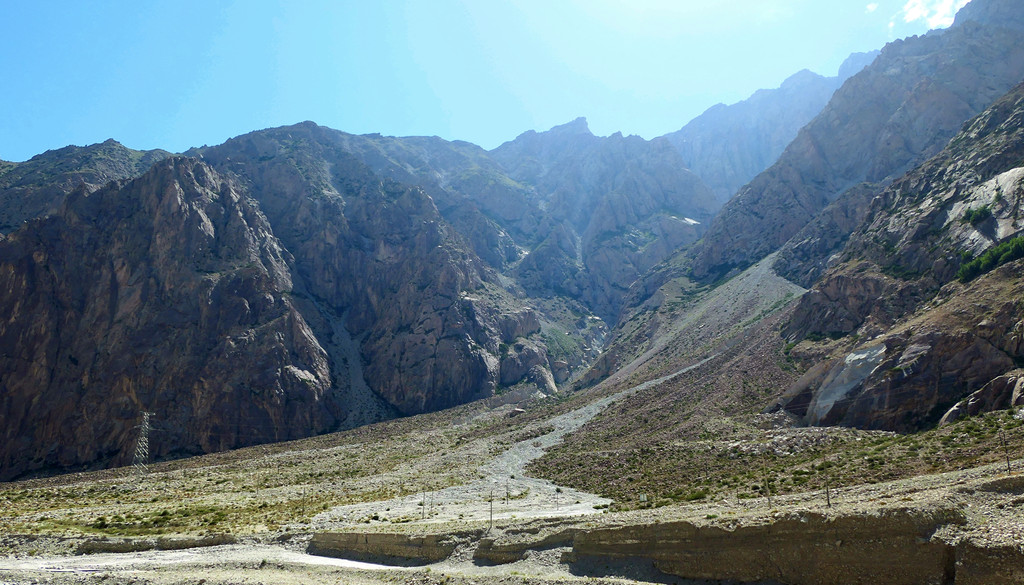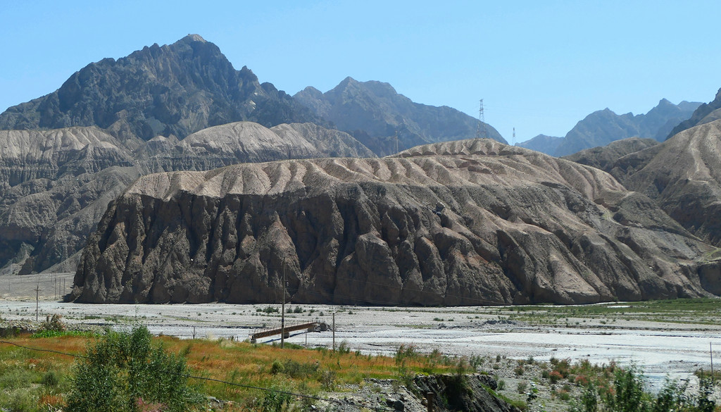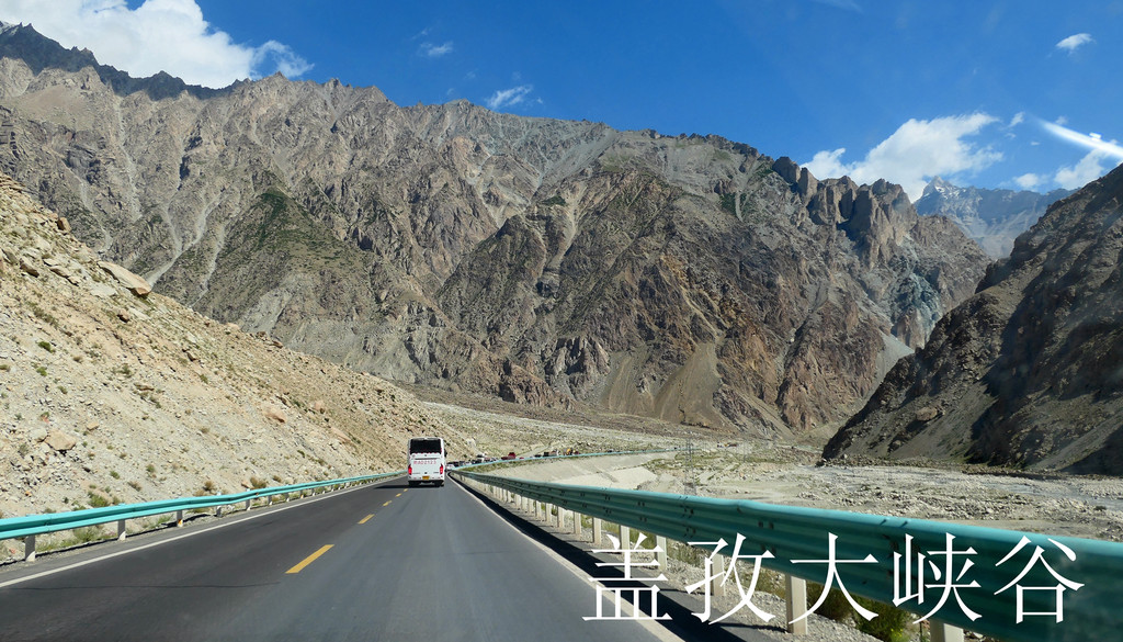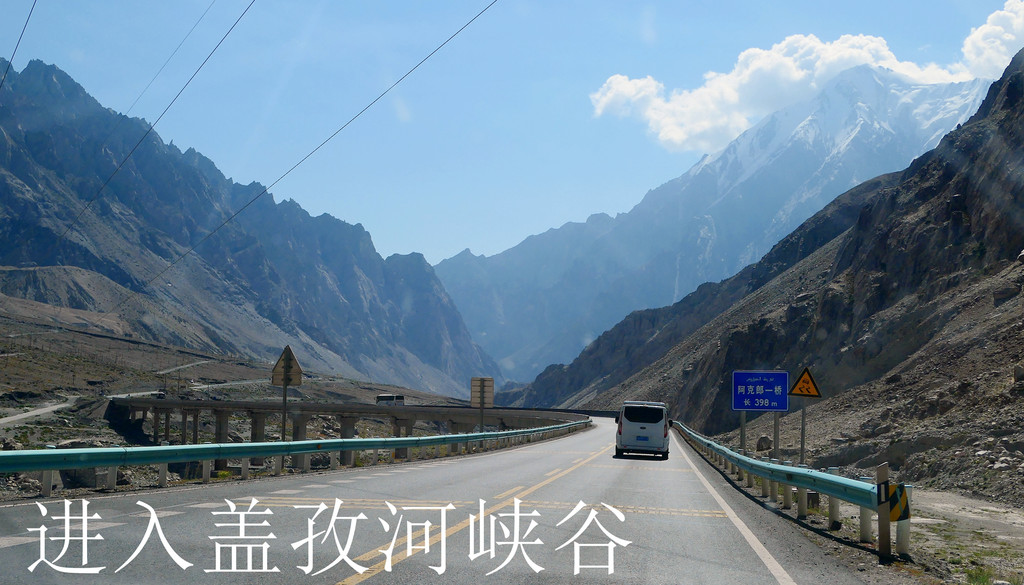公路跟随盖孜河蜿蜒,可能是因为上游白沙湖水库控流,此刻的河面仅余涓涓细流,干涸的河道内裸露着大片的河床。这一段的河谷既窄、又险,为了规避崎岖地势,沿河架起数道长长栈桥。虽然周边依旧怪石嶙峋,但汽车走桥通过,却是如履平川。