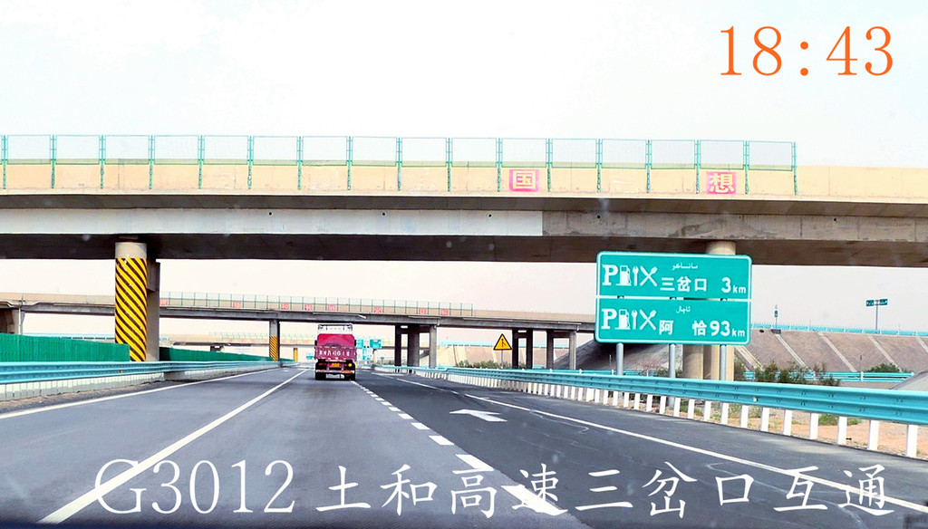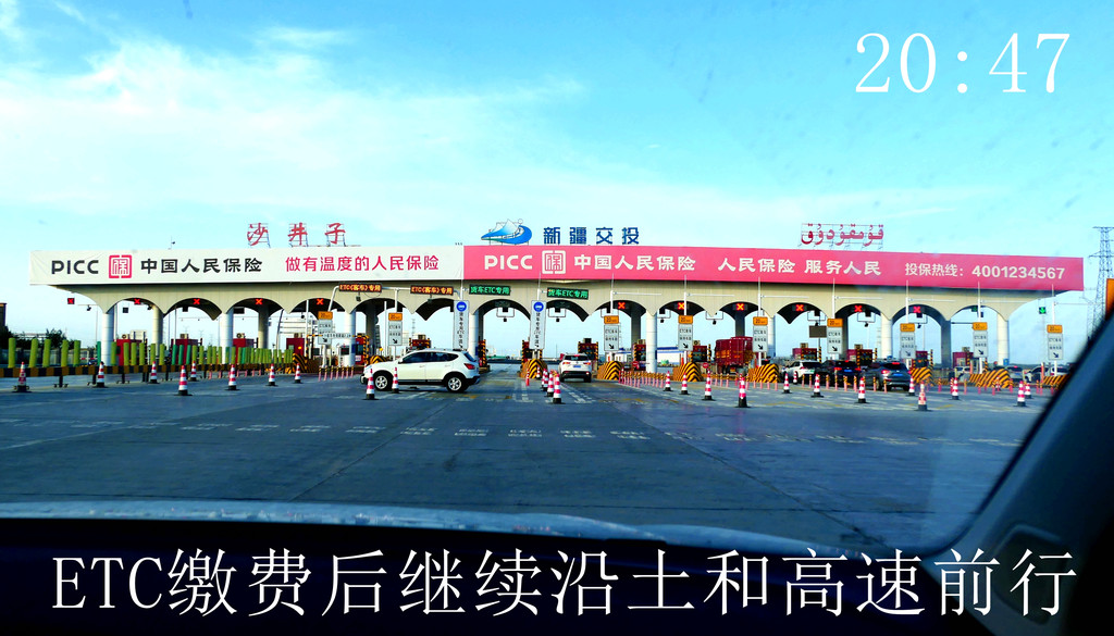 20:47通过“沙井子收费站”,缴费后继续沿土和高速前行,新疆与青海一样,高速公路都是在主干道上拦路设卡收费,这与内地明显不同,内地高速都是在上下高速的匝道出入口处设卡。