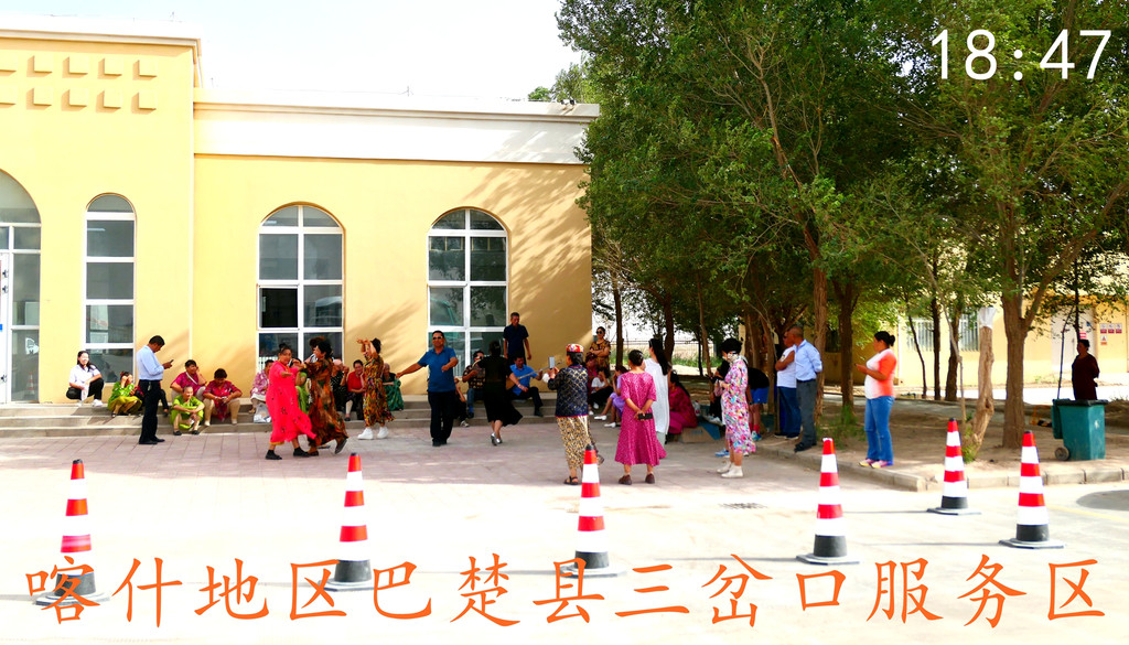 稍事休息后再次上路,18:47又在“三岔口服务区”稍停,看到有一大群搭乘长途汽车的维族乘客也在这里休息。当地人能歌善舞,就这么一丁点儿时间也都不拘一格地跳起舞来,此处是属于喀什地区的巴楚县。