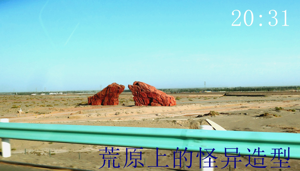 19:57在“阿恰服务区”稍停,此地已属阿克苏地区的柯坪县。20:31在行驶途中看到了奇特景象:两块巨大的红色“岩石”矗立在广袤荒原上。“巨石”看似并非天然,但若为人造,周边却又荒无一物,着实令人费解。
