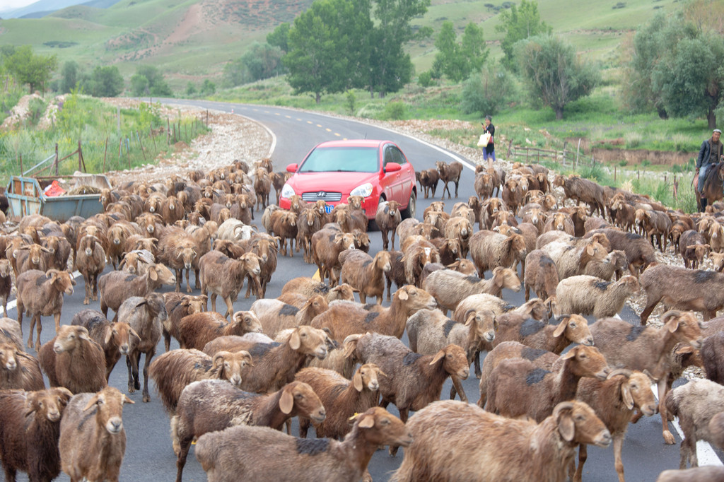 进入独库公路,翻越天山,进入平坦区域,映入眼帘的是大面积的羊群,与天上的白云遥相呼应。