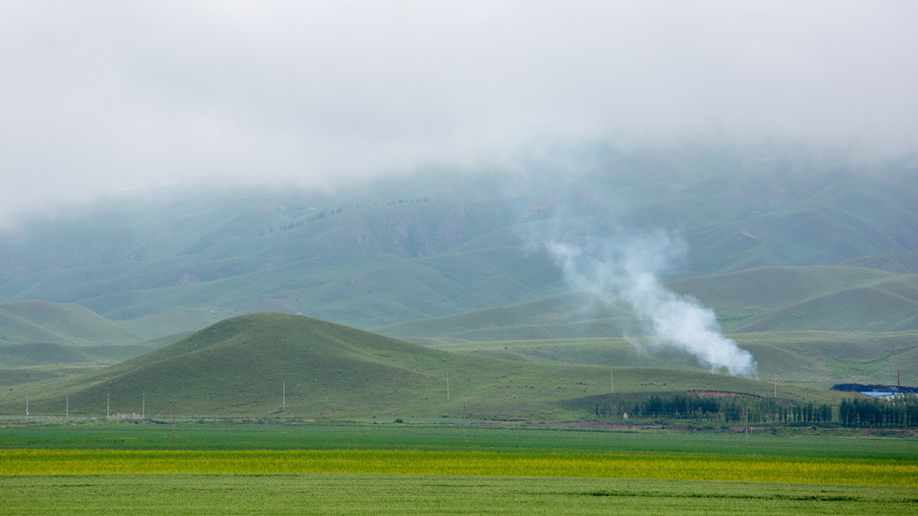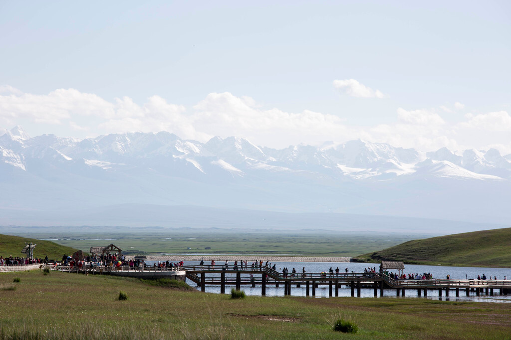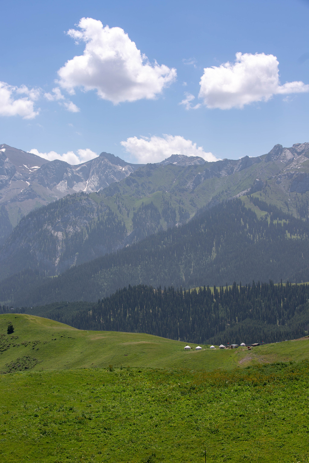 草原如绿色海洋,天山雪峰在草原背后云烟缥缈