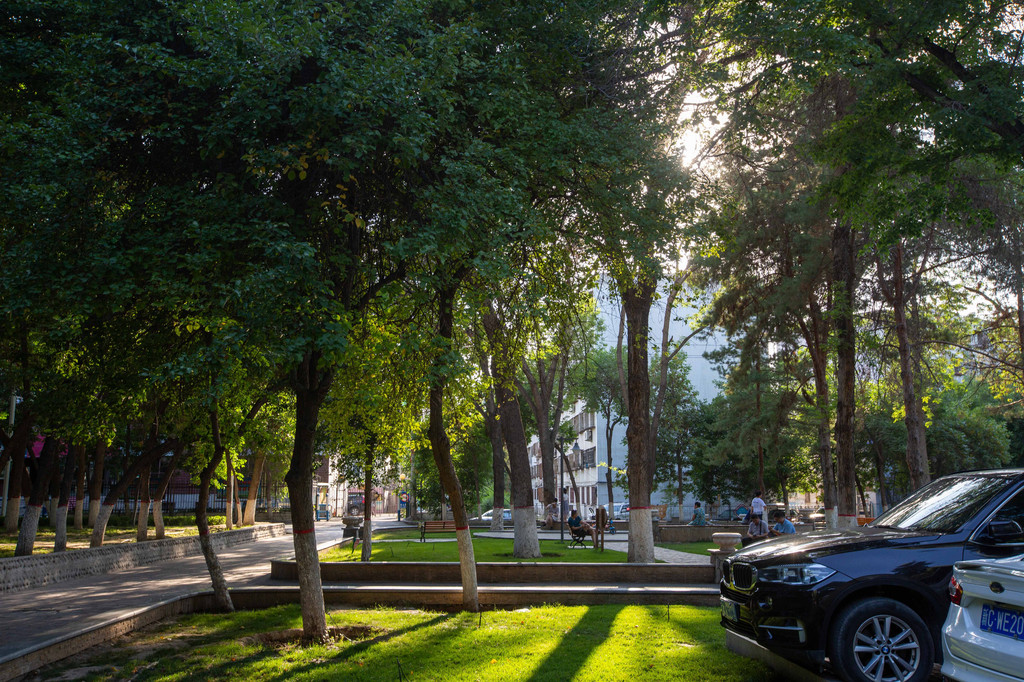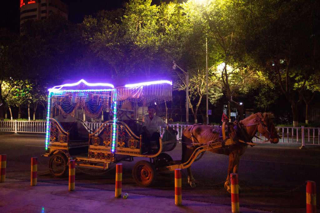 晚餐后,市内街景随拍,维吾尔族老汉赶着马车,车上放着民族音乐,地域特色十足。