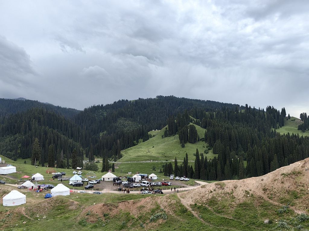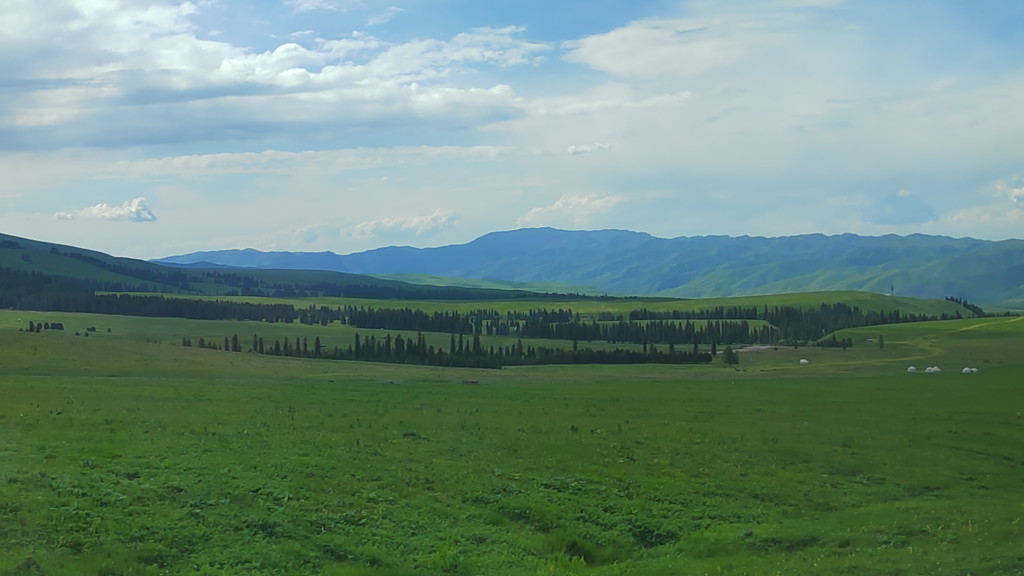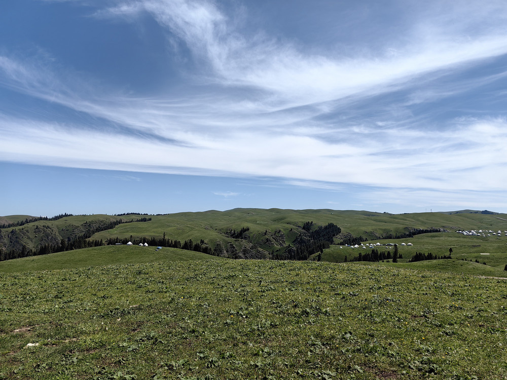 站在高处眺望,牧民的毡房和羊群犹如珍珠般洒落在草原上,雪岭云杉郁郁葱葱。广袤多彩的草原令人荡气回肠,置身于鲜花、碧草、云杉之间,万籁俱静,仿佛踏入梦幻天堂。