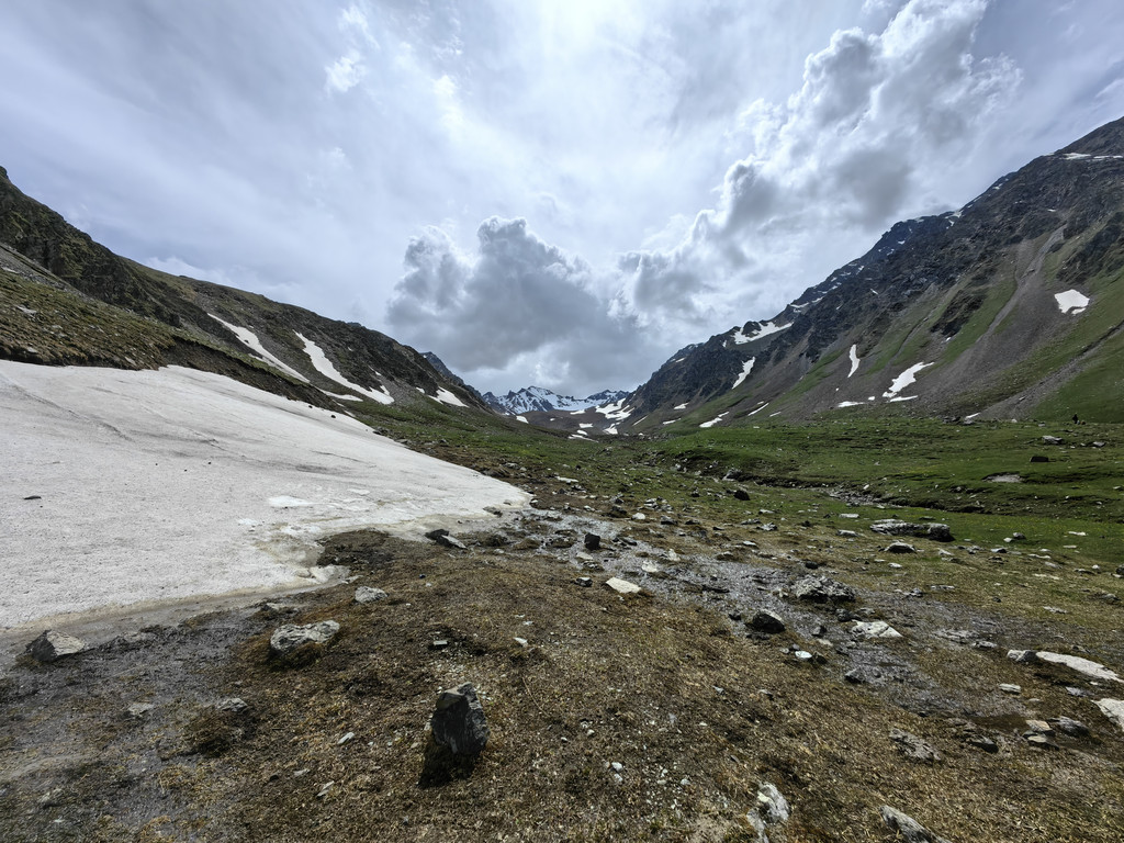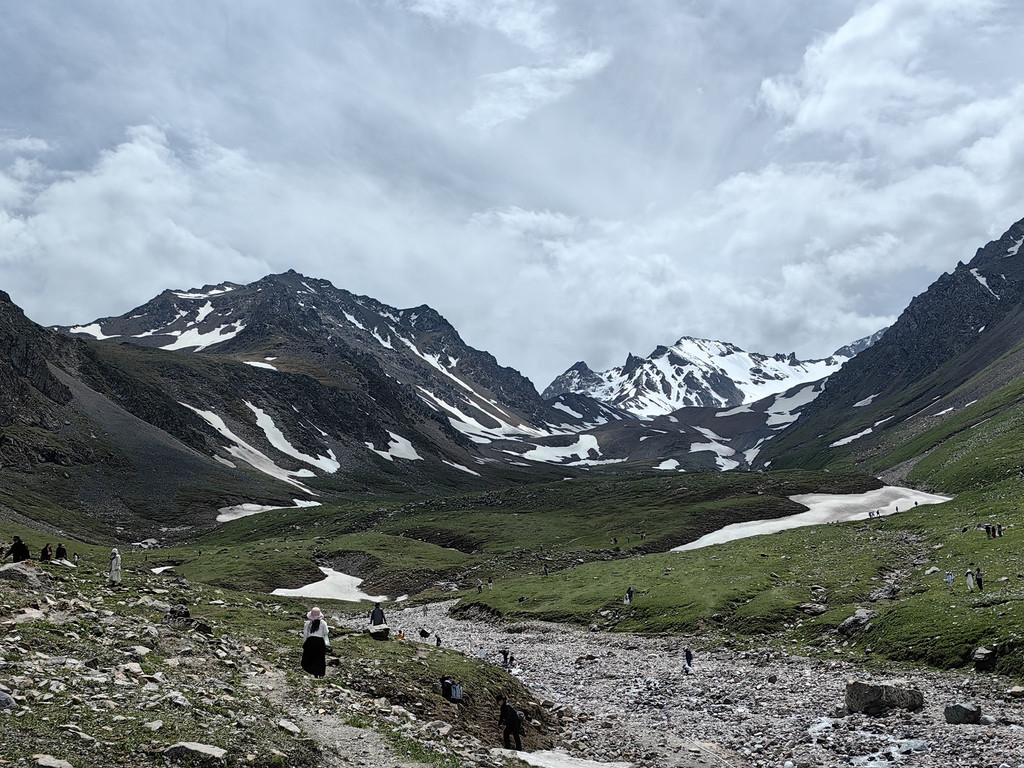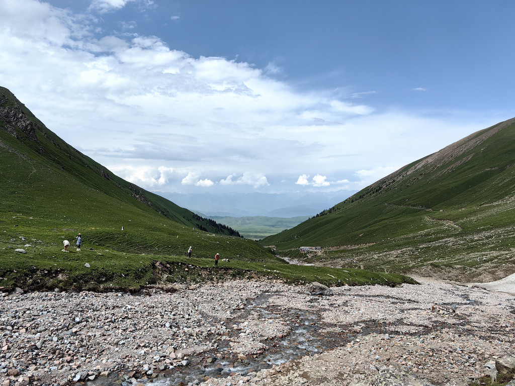 雪莲谷海拔较高,大多数游客都是下车后在附近拍照,我们沿着山坡继续向上走,人越来越少。来到雪线附近,气温也陡然下降,这是我们接触雪山最近的一次。雪谷空旷宁静,生长在乱石堆里野草小花展示了它们顽强的生命力。举目蓝天如洗,白云飘逸,遥望草原辽阔,毡房点点,令人心境开阔。