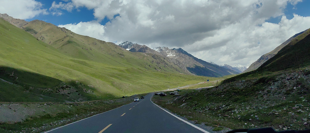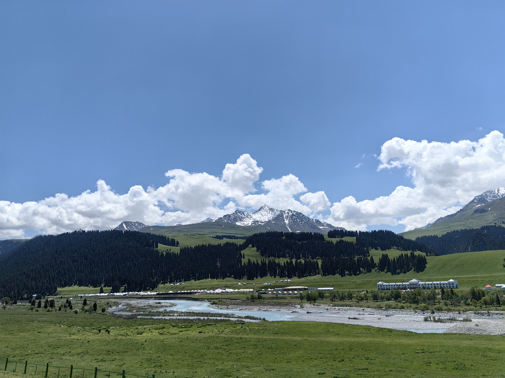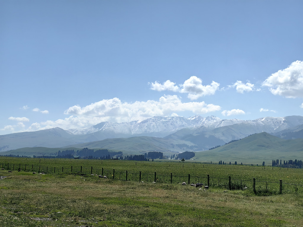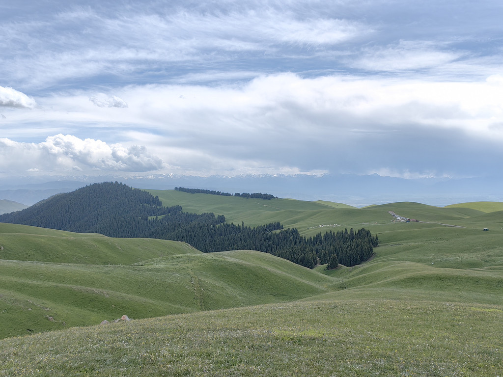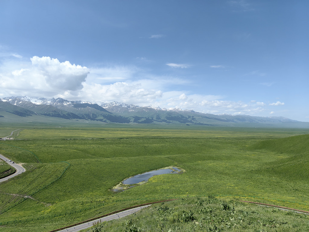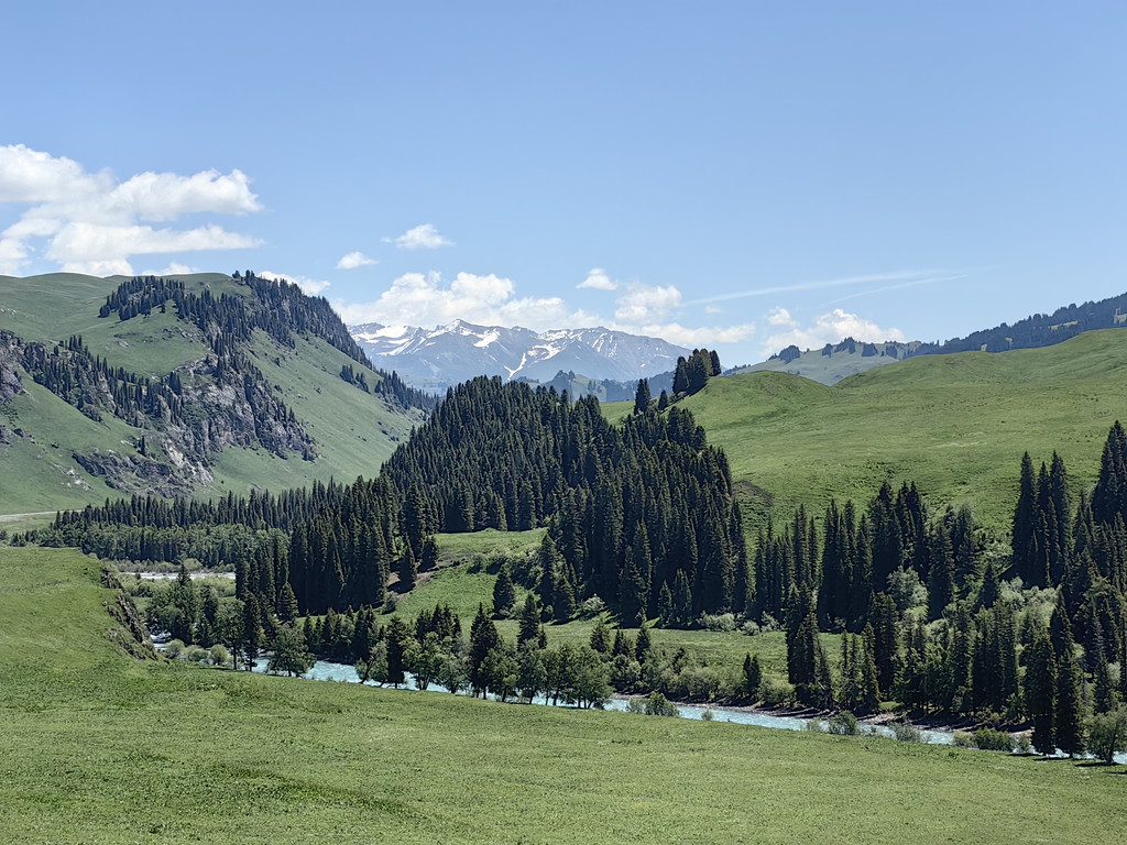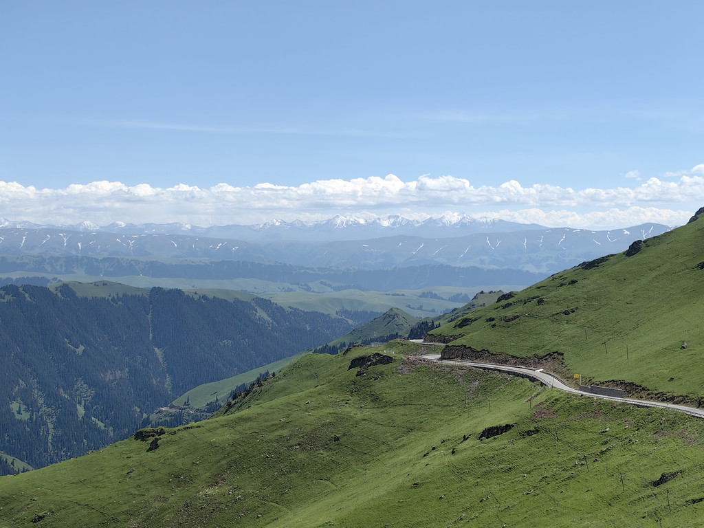 我们去乔尔玛烈士陵园进行瞻仰后,继续沿独库公路前往那拉提。路上满眼是青翠的云杉林和绿茸茸的草场,雪峰与白云为伴,风景美不胜收。