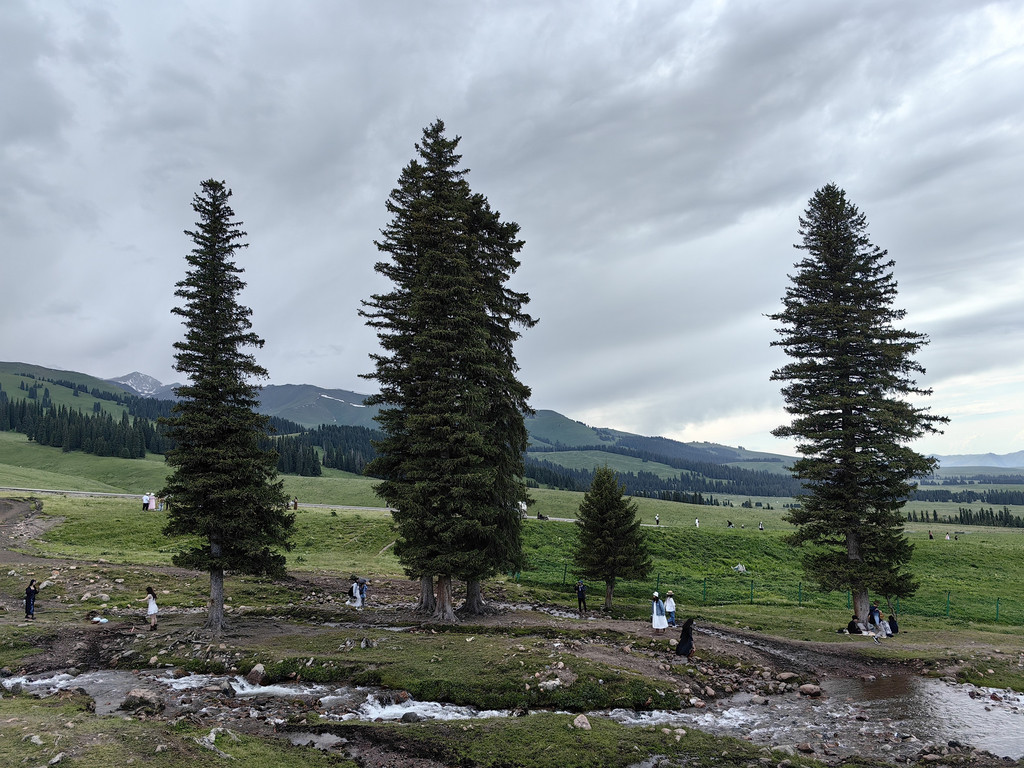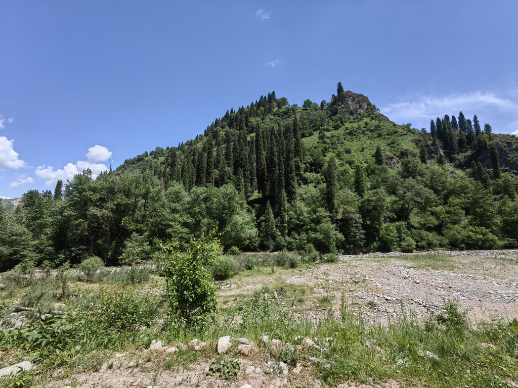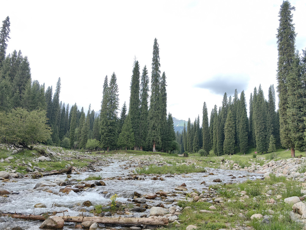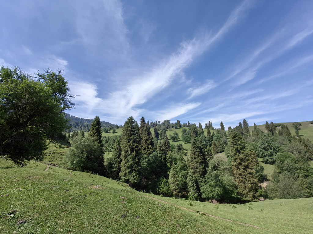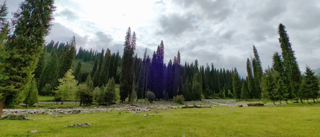 那拉提景区河谷草原的尽头是森林公园,公园中遍布高大的云杉。