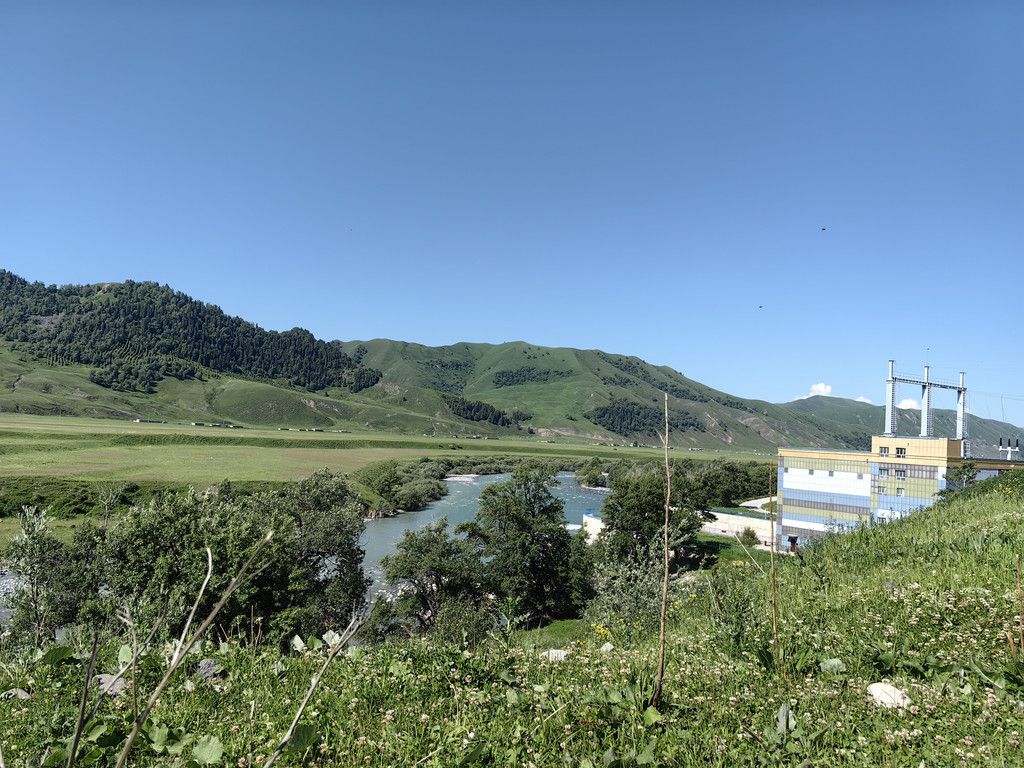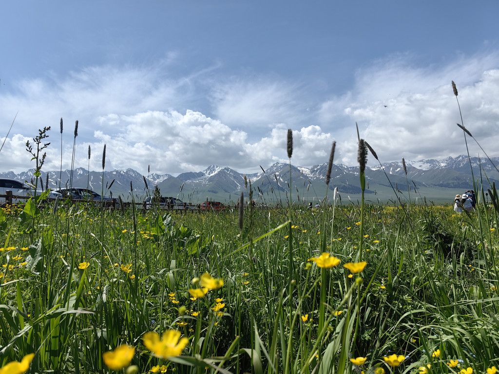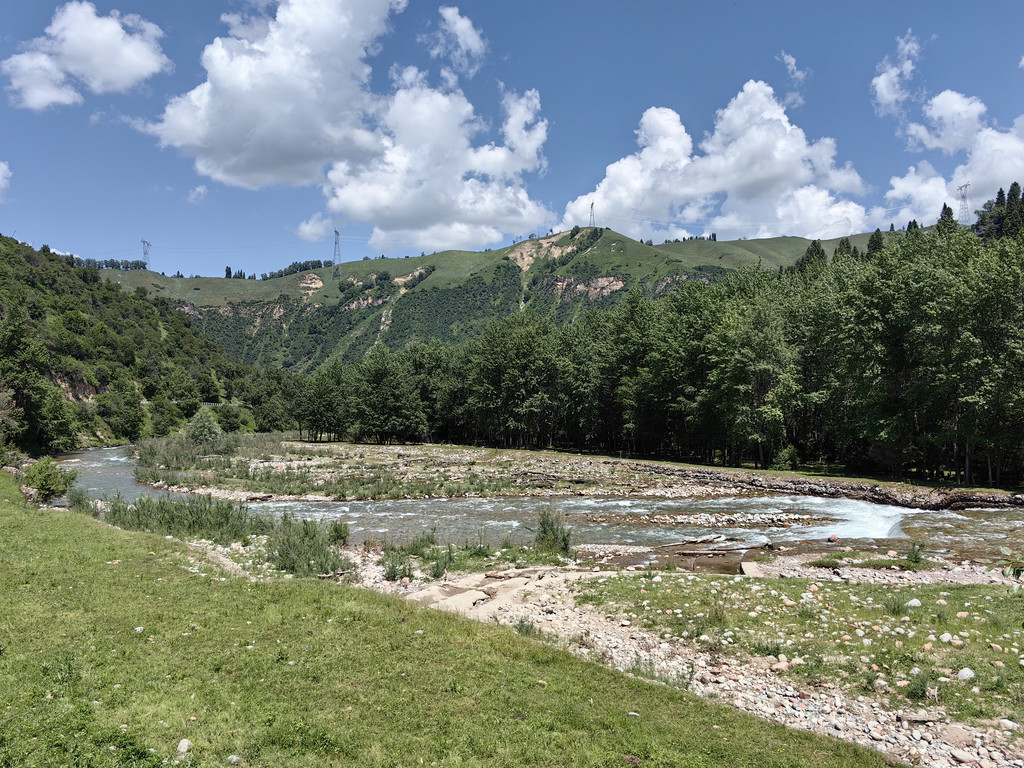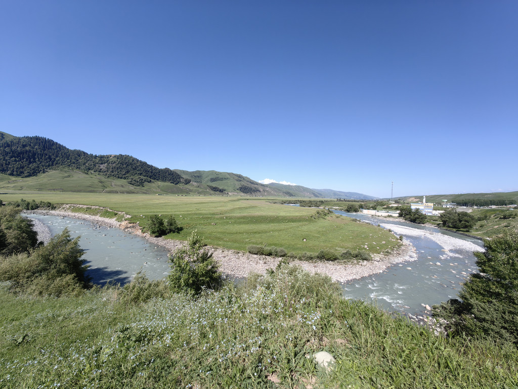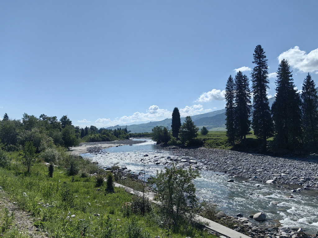 伴着喀什河前行,满眼绿色,河水湍急,河边草地上零星开着黄色的小花。