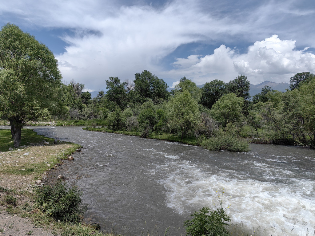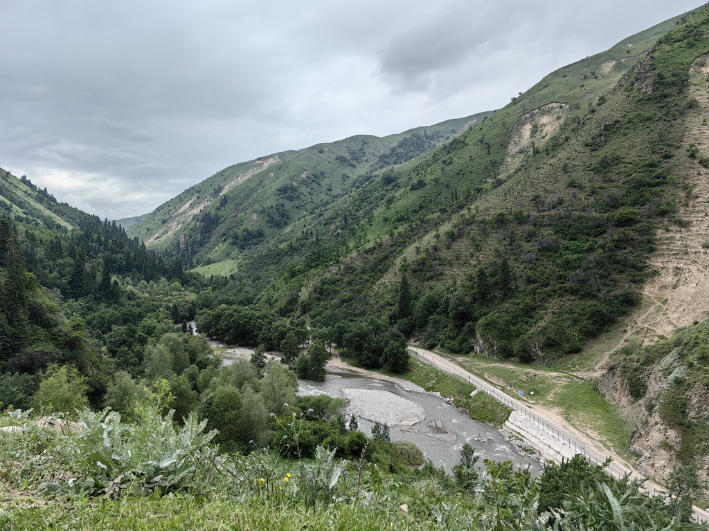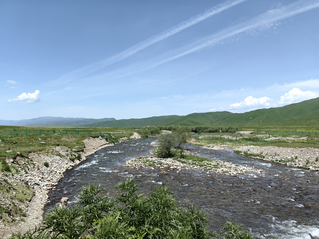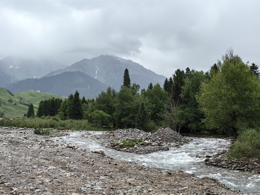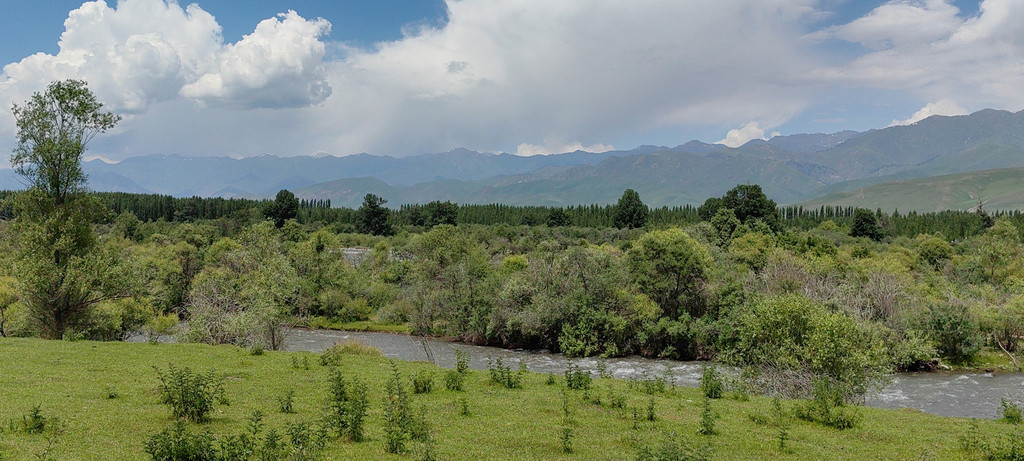 伴着喀什河前行,满眼绿色,河水湍急,河边草地上零星开着黄色的小花。