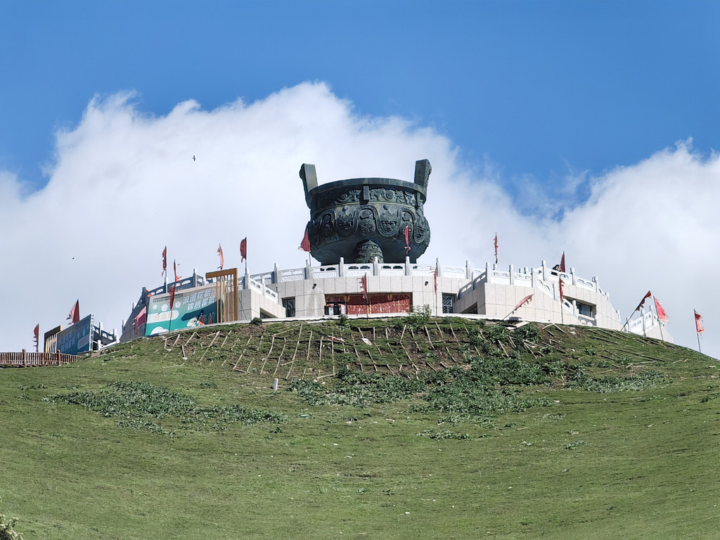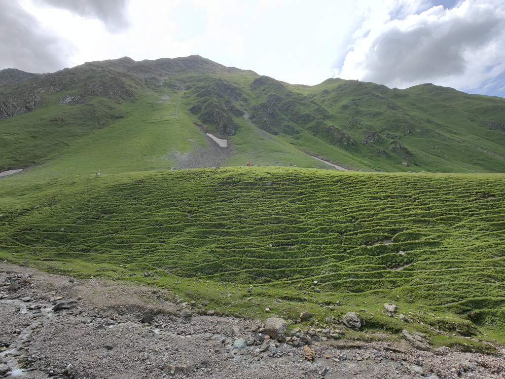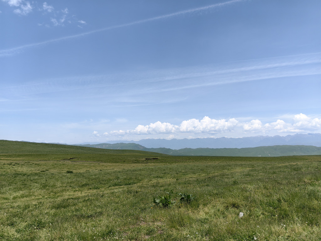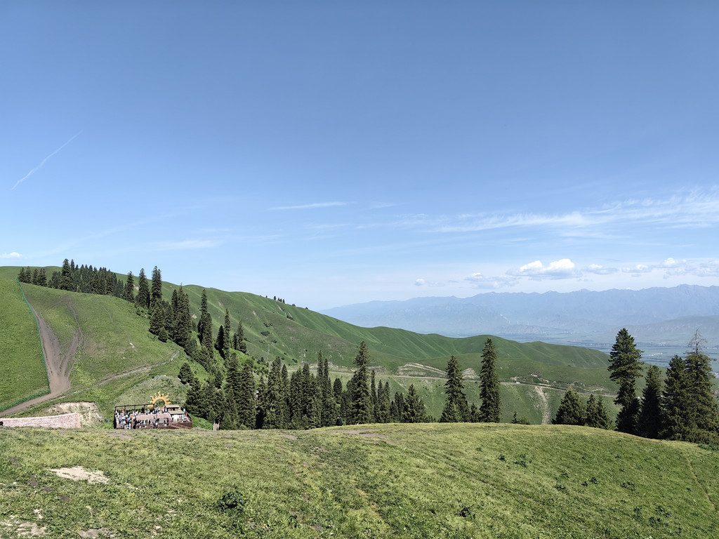 离开依提根塞,进入盘龙谷道。因为景区正在进行道路提升,在半山腰的岔路口上山的路被封住了,只能走另一条路。我们在山坡上停下车,环望四周,蓝天白云下绿草如茵,辽阔的高山牧场满眼绿色,一望无垠,十分赏心悦目。