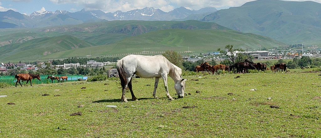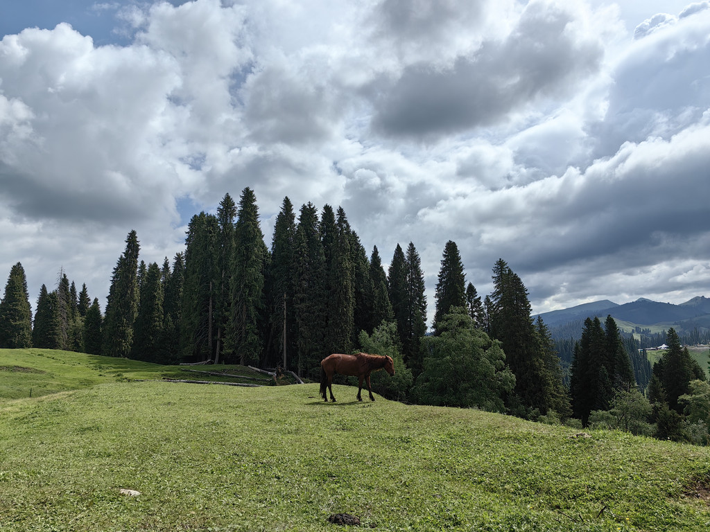 我们沿着这条山路,又返回山下的依提根塞。沿公路继续前行,远处的雪山,近处的森林和草原,还有草地上悠闲自得地吃草的马儿,形成一幅立体的画卷。