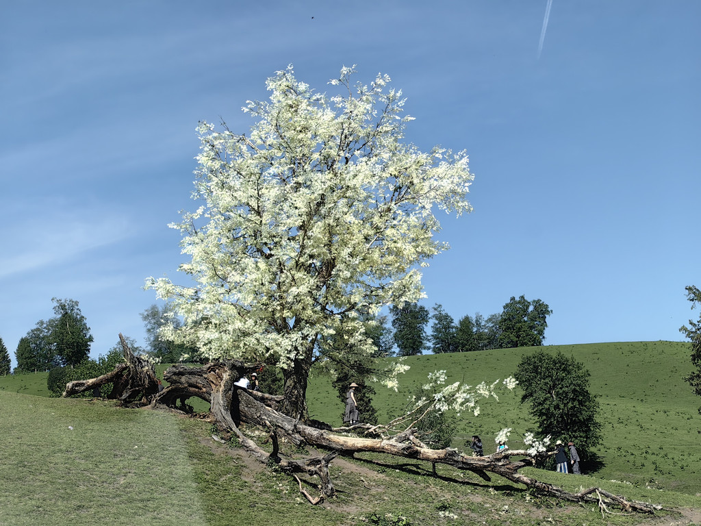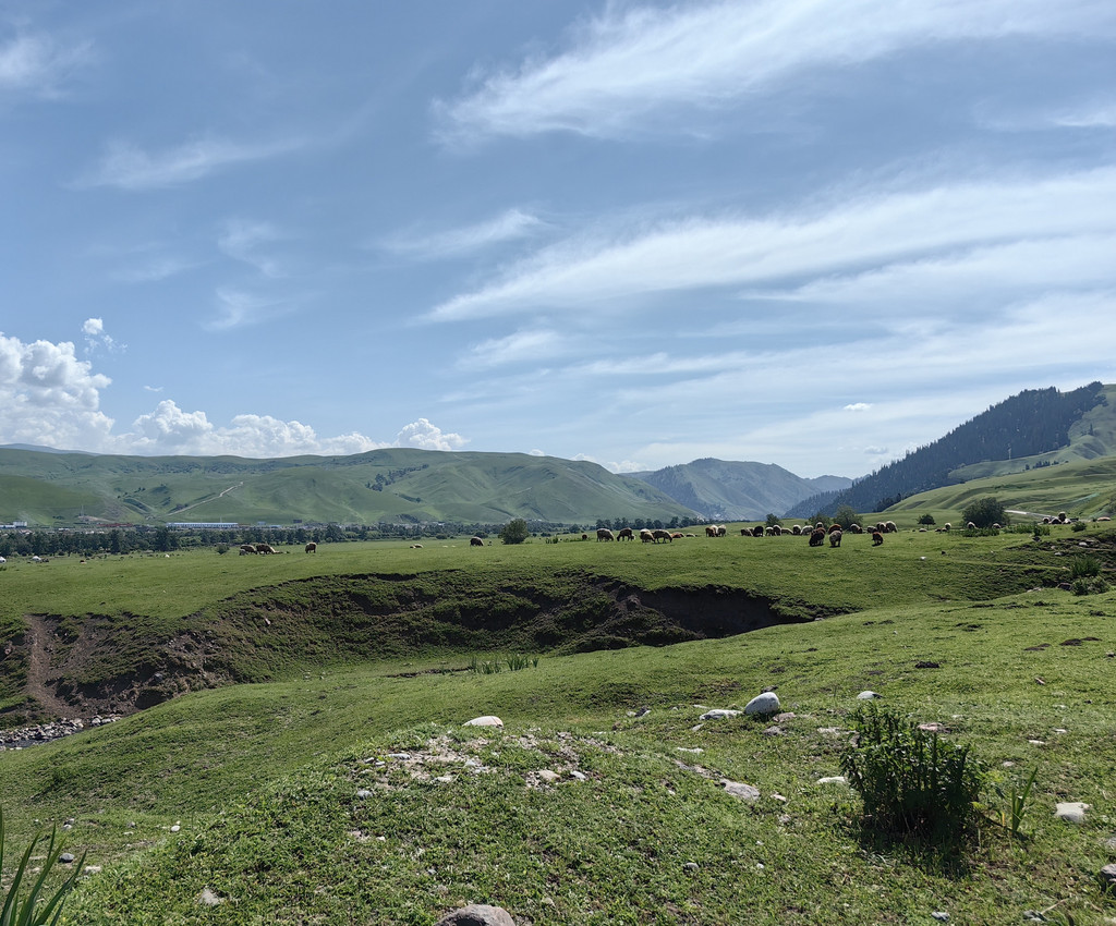 福寿山景区是春季观赏野杏花的好地方,我们六月初到这里,错过了杏花盛开的时节,只有漫山遍野郁郁葱葱的果树。将车开到山顶,放眼望去,河流蜿蜒曲折,连绵起伏的草场,遍布着野生果树,山坡上散布着羊群,与蓝天白云交织在一起,绘成一幅恬静的山水画卷。