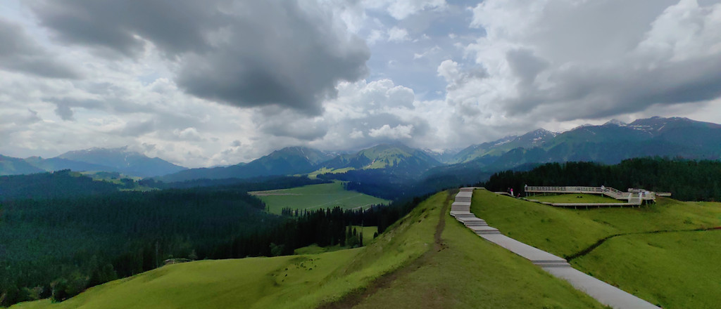 景区可以自驾进入游玩,我们首先来到齐梦德观景台。沿栈道登上观景台,举目四望,青山环绕,溪水蜿蜒,山呈翠色,草如绿茵;远眺雪山,近览林海,其景色之美不可言状。