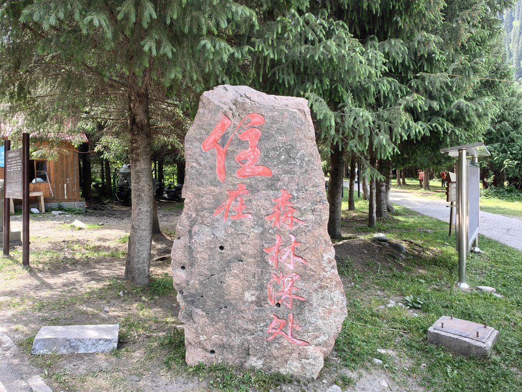 我们原计划去云上草原和云杉王等景点,沿景区公路前往,在公路旁看到一个很小的停车场,也没有看到指示标牌,我们没有停车,结果直接开出了景区。问了门口的工作人员才知道,刚才看到的停车场就是去云上草原和云杉王的。景区的道路都是单行线,要再次进入景区需要重新返回景区入口,而两地相距20多公里。今天我们还要到100公里外的新源县城住宿,重新返回景区入口会耽误很多时间,我们只好带着遗憾离开库尔德宁。