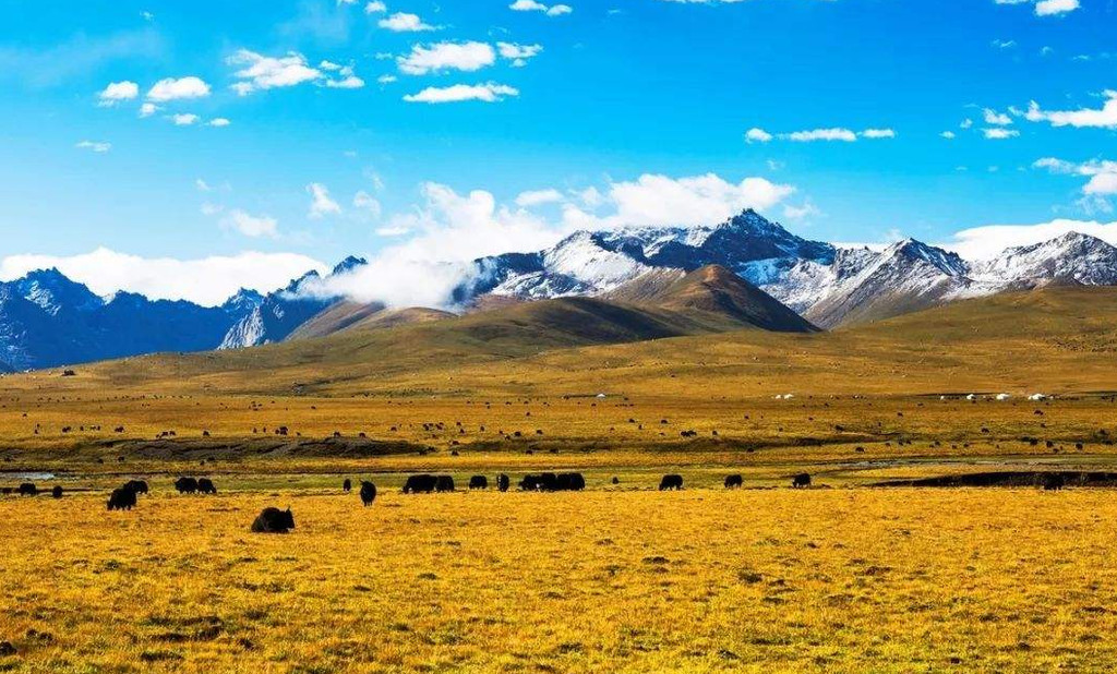一到秋天,大草原上成群的牛羊依旧在享用着这片丰茂的大地,草色从绿色变为金黄,像是铺上了一张巨大的地毯。