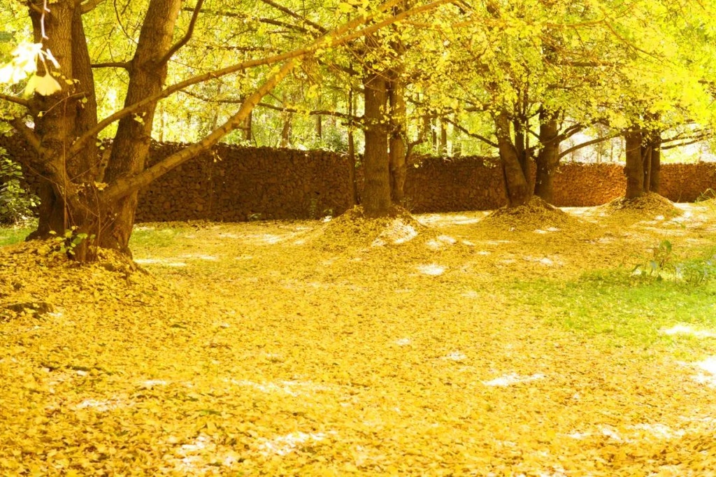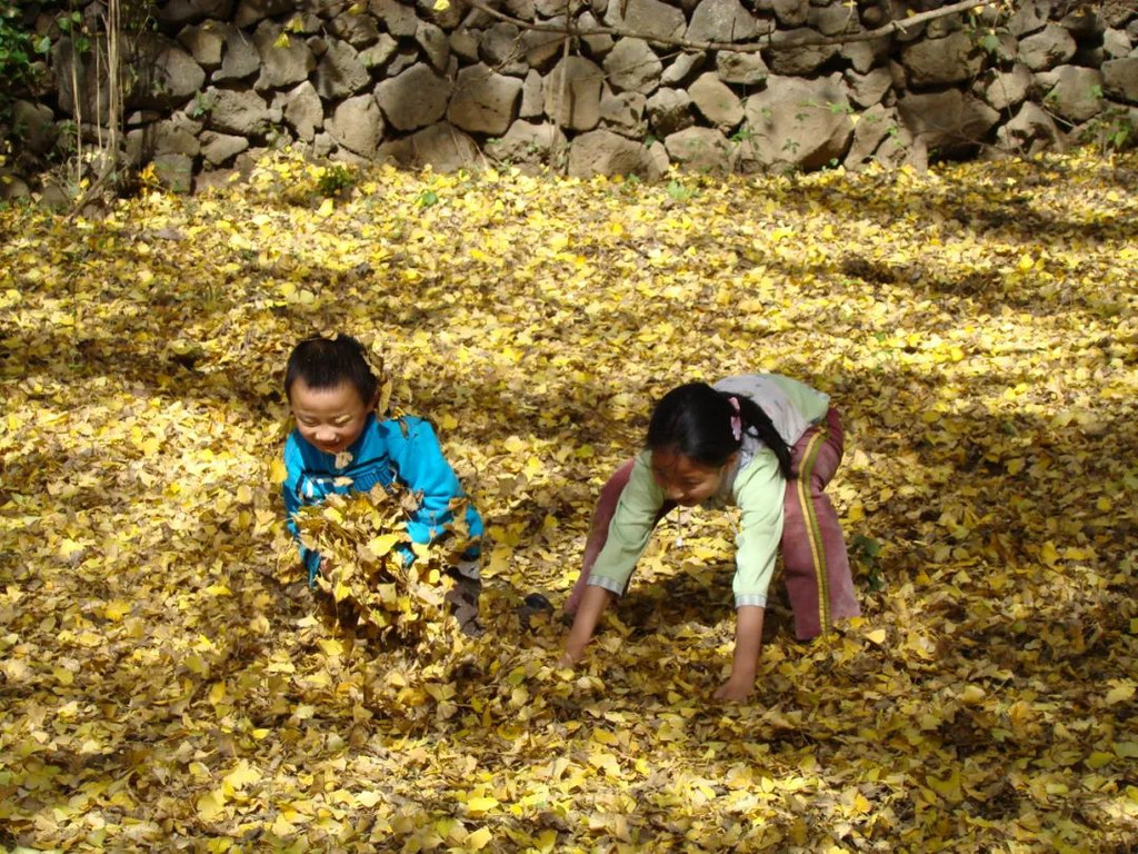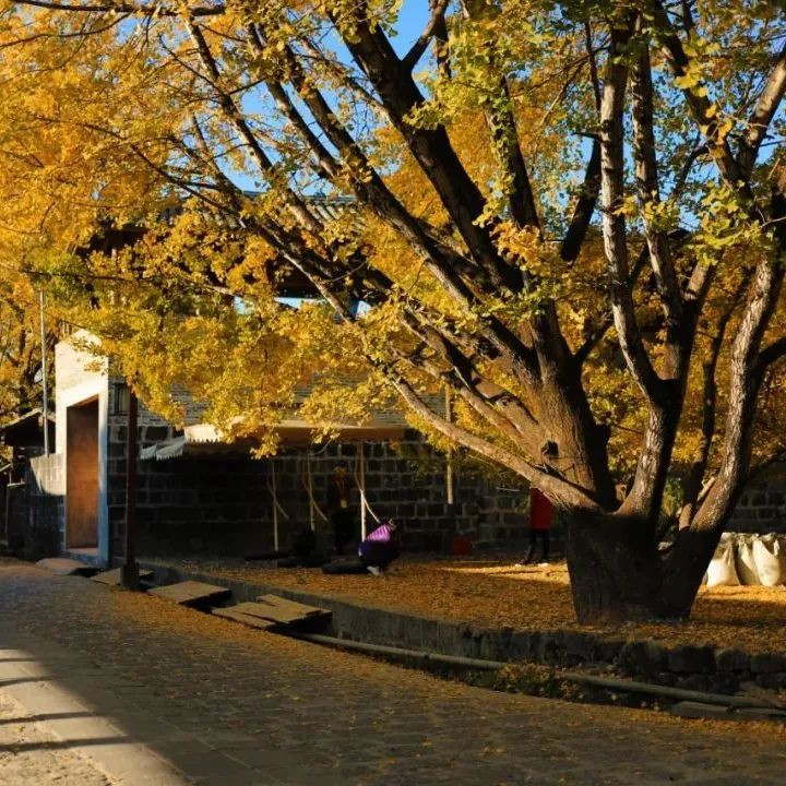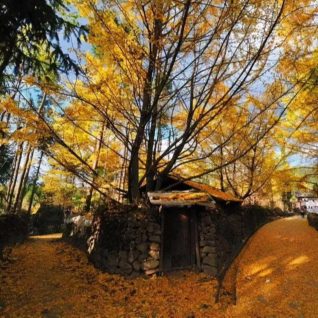 到赏叶时节,银杏村人从不清扫落叶,一阵风吹过,轻盈的银杏叶随着风从树上飘落,厚厚的积满一层又一层。