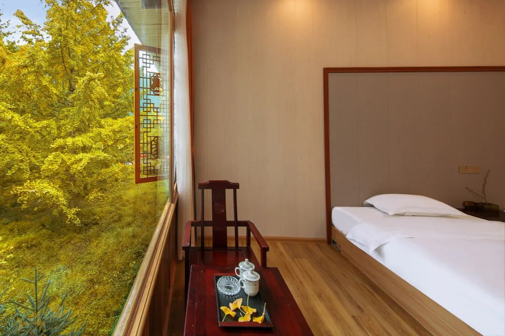 两层小楼,窗户为透明玻璃,靠近银杏树,静坐房间内拉开窗帘,银杏美景就会自动钻入房中。