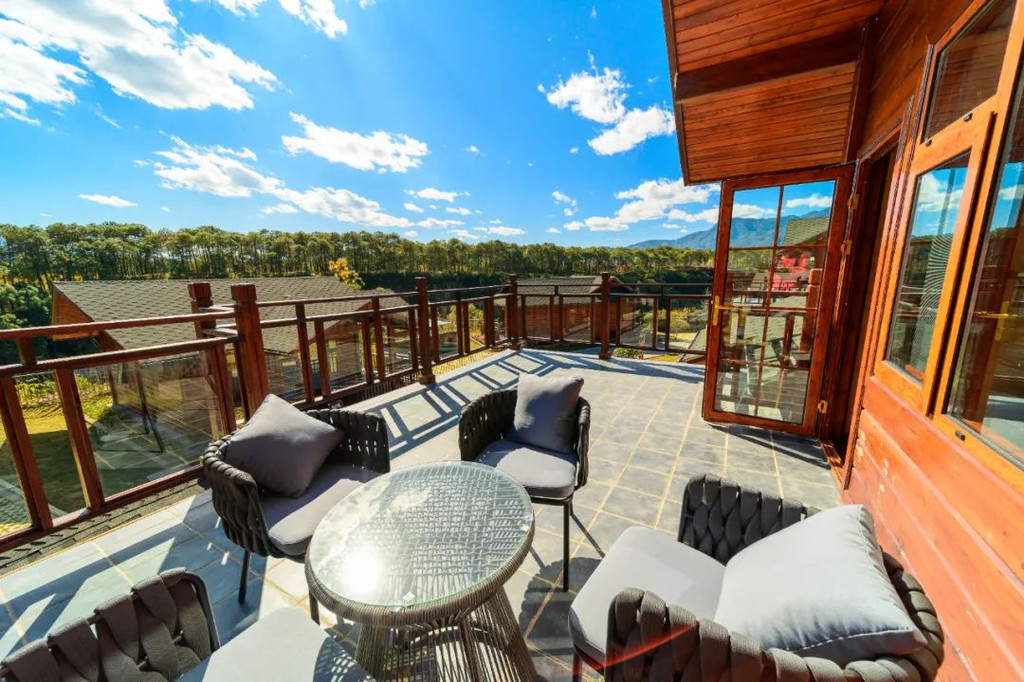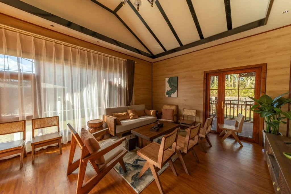 悬崖木屋酒店为独栋别墅,整体建筑为木质结构,颜色以暖色调为主,充分融合了当地建筑特色,和周围环境融为一体,既和谐又独立。