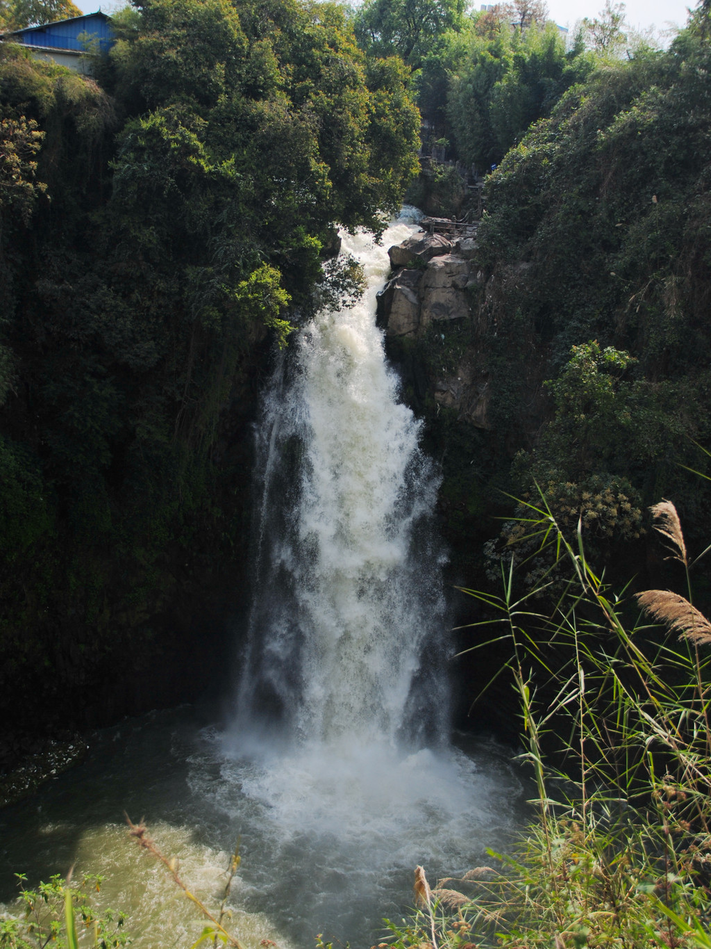 它是我国少见的城市瀑布。瀑布落差46米,飞溅之水雾,漂润崖谷,气势磅礴,俗有“龙洞垂帘”之称,曾被明代大旅行家徐霞客妙称为“久旱不晴”之绝景。