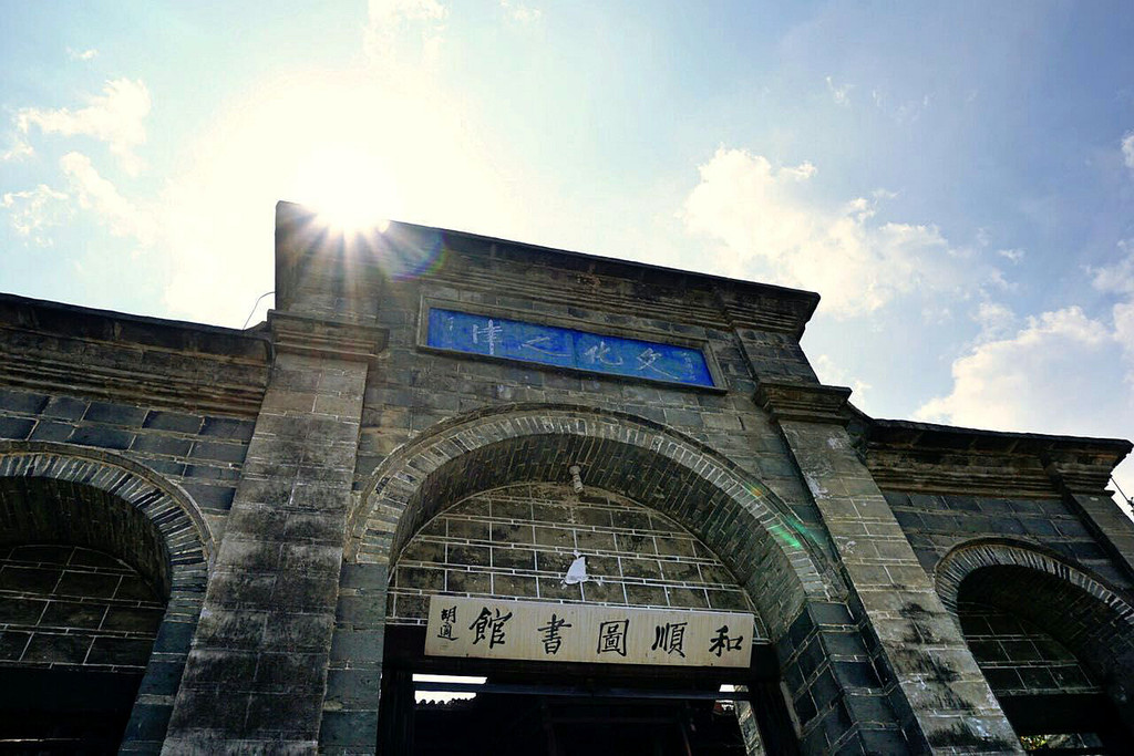 大门为清光绪年间所建汉景殿的牌楼式大门,门额悬和顺清代举人张砺书“和顺图书馆”匾额,蓝底白字,十分醒目。