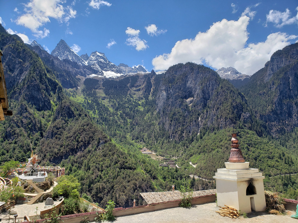 在巴拉村的民居阳台上,仰望圣洁的格宗雪山。